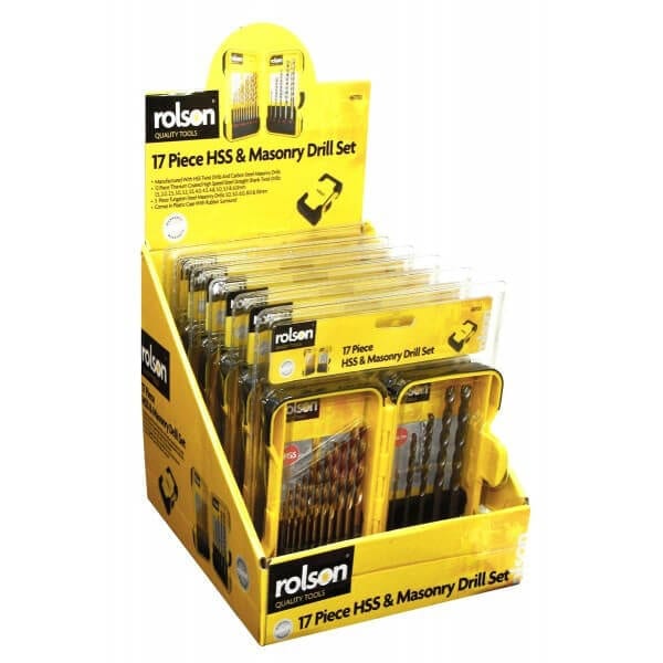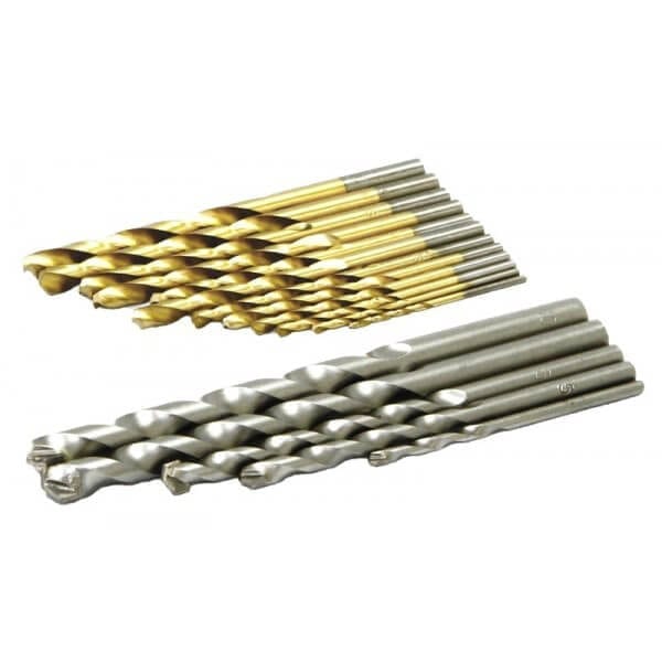 17pc Combination Drill Bit Set Manufactured with HSS twist drills and carbon steel masonry drill bits. 12pc Titanium coated HSS straight shank twist drills 1.5, 2.0, 2.5, 3.0, 3.2, 3.5, 4.0, 4.5, 4.8, 5.0, 5.5, 6.0mm. 5pc masonry drill bits 3.0, 5.0, 6.0, 8.0, 10mm