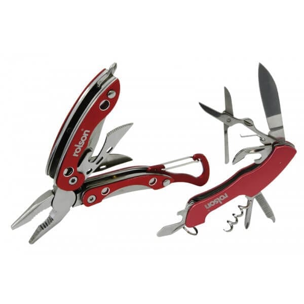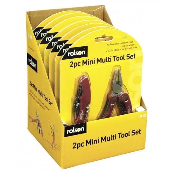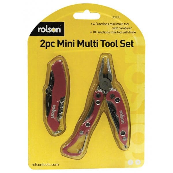 2pc Mini Multi Tool Set 6 in 1 mini multi tool with functions that include knife, bottle opener, saw, cross point screwdriver, pliers, and belt clip carabiner. 10 in 1 mini multi knife with functions can opener, knife, scissors, bottle opener, slotted screwdriver, crosspoint screwdriver, corkscrew, nail file/cleaner, and supplied with key ring facility