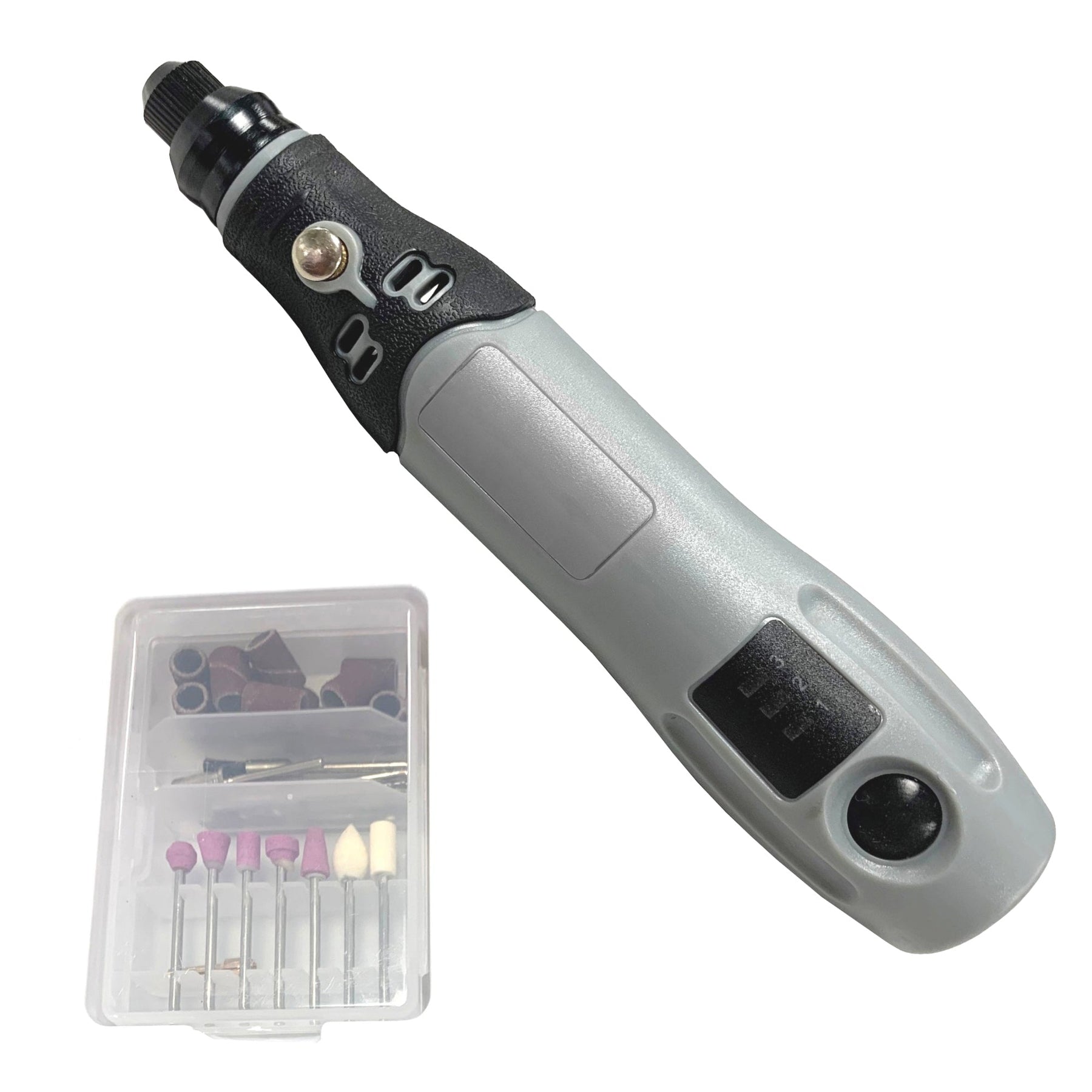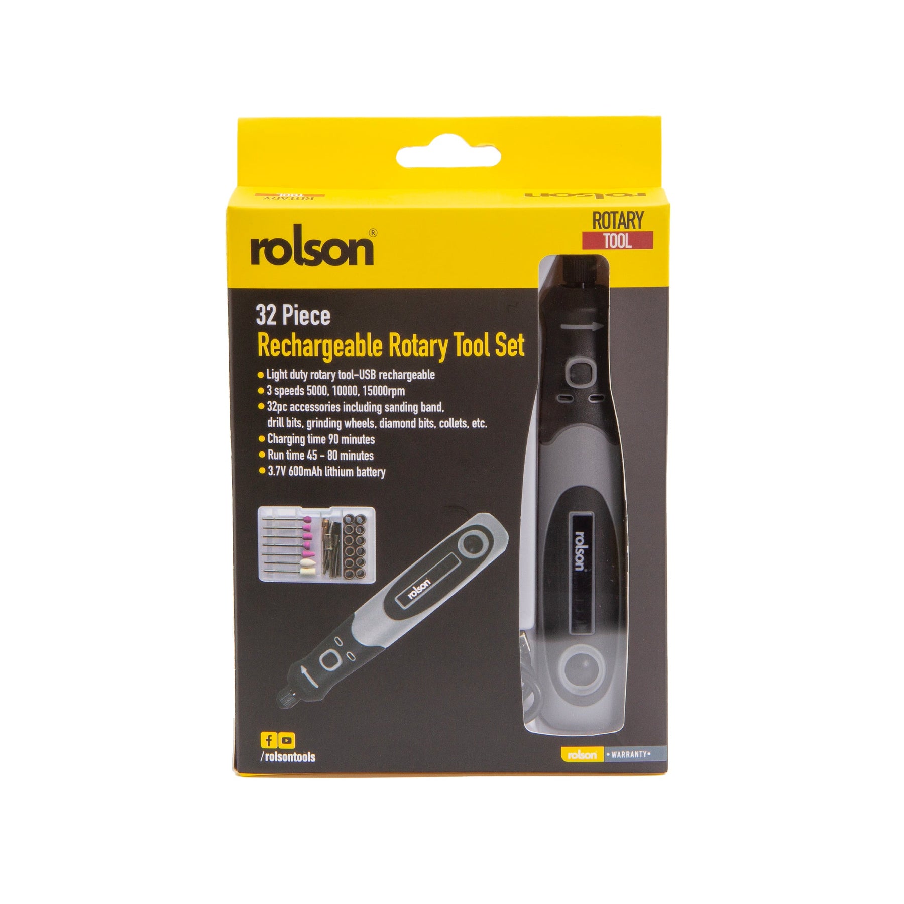 3.6V 33 Piece Rechargeable Cordless Rotary Tool Set - Light duty rotary tool - 3.6V rechargeable lithium battery. Three speeds 5000, 10000, 15000rpm. Charging time 2hrs, run time 90mins. 32pc accessories including nylon brush, high speed steel cutter, mandrel for sanding bands, 12pc sanding bands, 2pc 2.3mm drill bits, 2pc felt wheels, 2pc collet, 6pc diamond tipped bits, 5pc stone grinding bits & Type C- USB lead