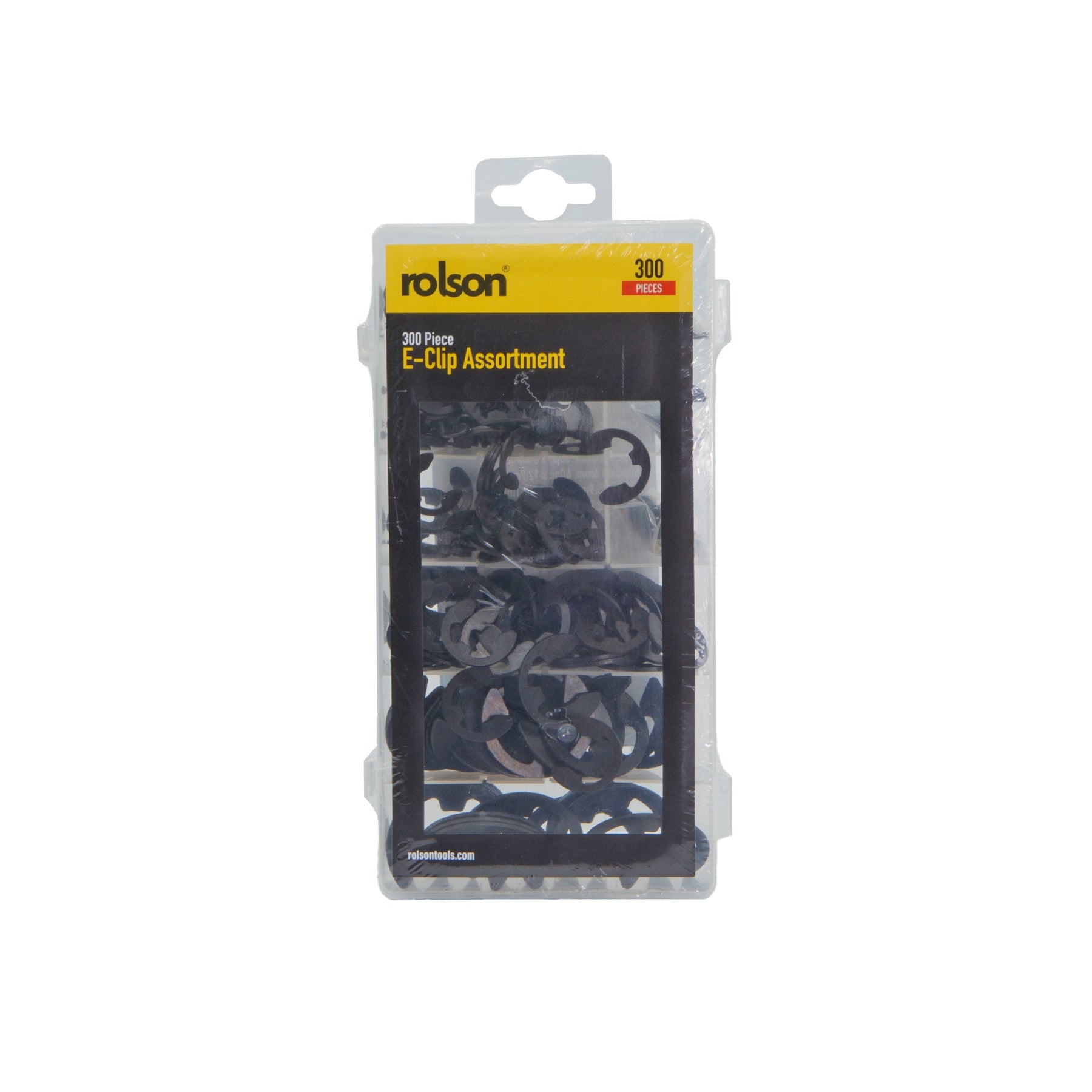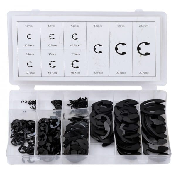300 Piece E Clip Assortment Contains nine most popular sizes, including 30pc 1.6mm, 30pc 3.2mm, 40pc 4.8mm, 50pc 6.4mm, 50pc 9.5mm, 40pc 12.7mm, 20pc 15.9mm, 20pc 19.1mm, 20pc 22.2mm