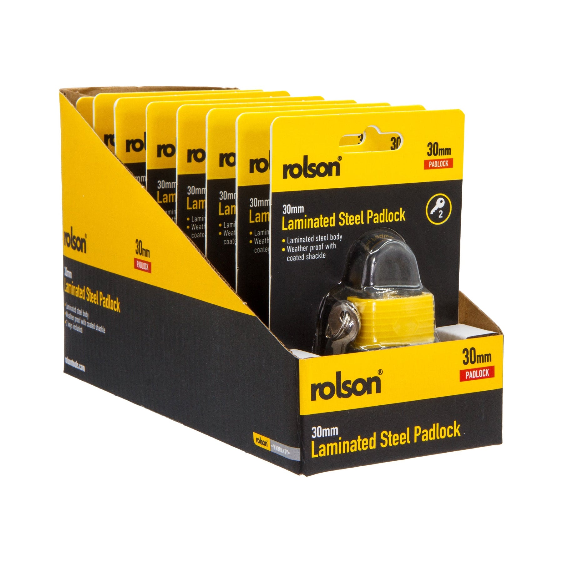 30mm Laminated Steel Padlock - Laminated steel body, weather resistant with coated shackle. Supplied with two keys