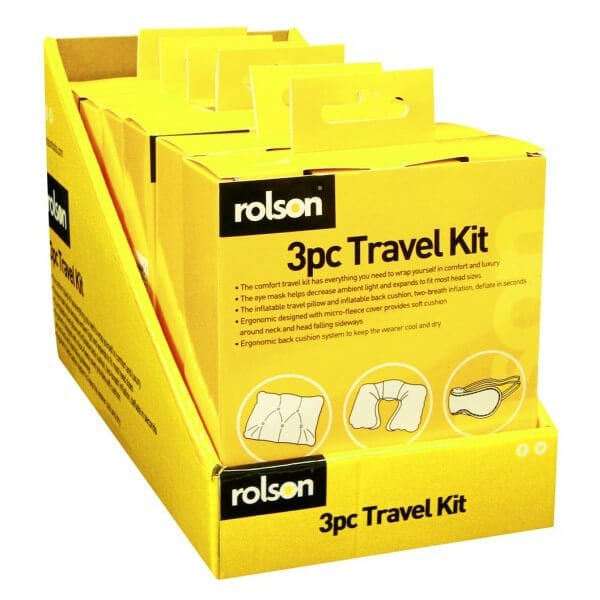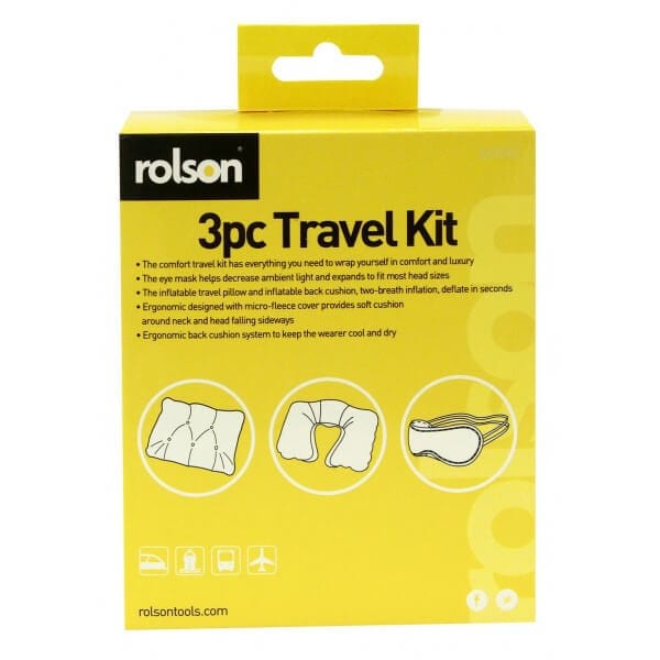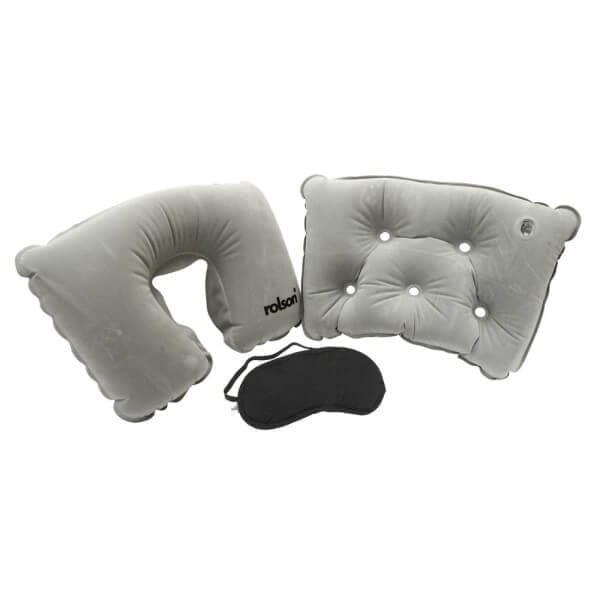 Consists of elasticated eye mask, inflatable neck pillow and inflatable back cushion. Easy to deflate once used