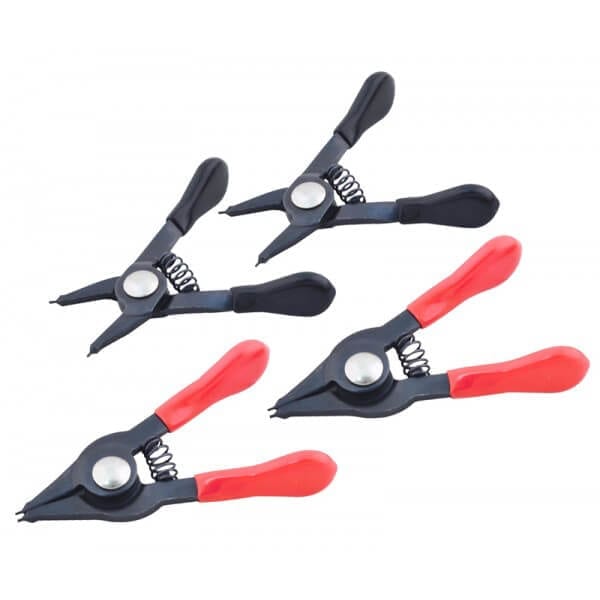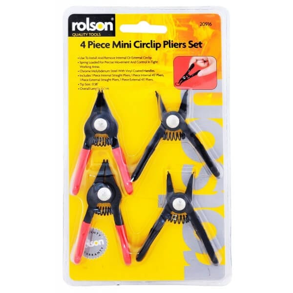 4pc Mini Circlip Pliers Manufactured from chrome molybdenum steel with vinyl coated grips. Sprung loaded for precise movement and control in tight working areas. Includes internal straight pliers, internal 45 degree pliers, external straight pliers, external 45 degree pliers. Tip size 0.38, overall length 75mm