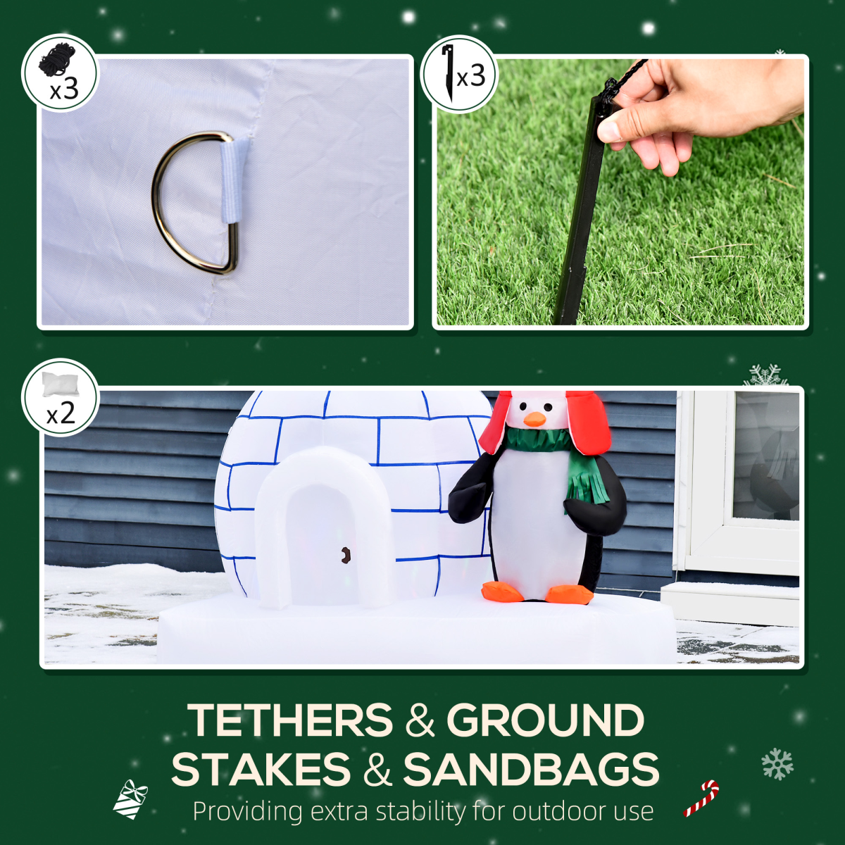 5ft Christmas Inflatable Penguins Wearing a Scarf with Ice House - Indoors and Outdoors" Description: - Inner lights for a cool glow at night - Automatically inflates when connected to power, deflates just as easily too - Penguin around igloo design is cute and perfect for Christmas and Winters - Includes: 4 x ground stakes, 2 x guy ropes, 1 x inner fan, and 2 x sandbags - Durable polyester shell is secure against light water and liquids