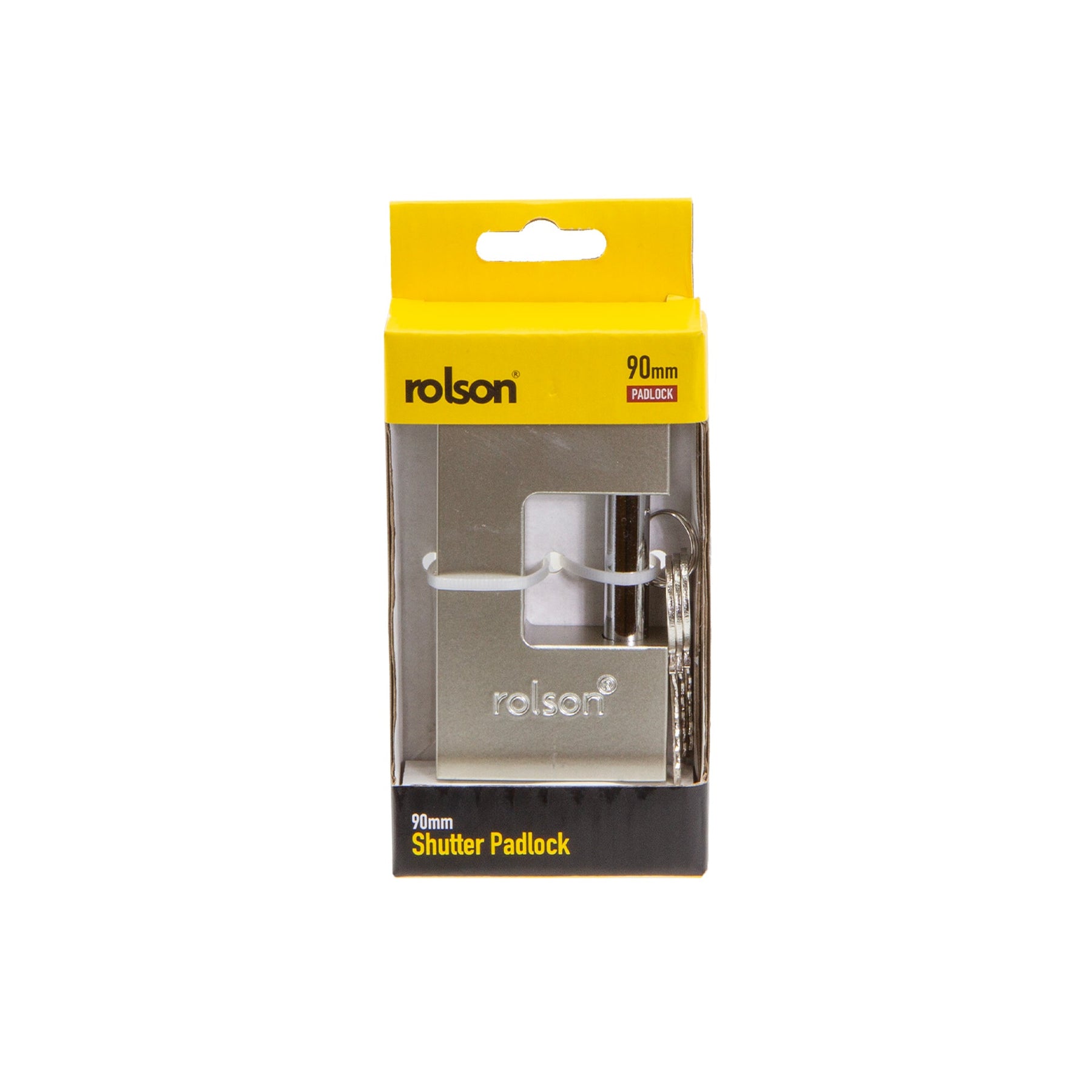 90mm Shutter Padlock - Solid iron body, overall dimensions 90 x 20 x 55mm. Supplied with four keys