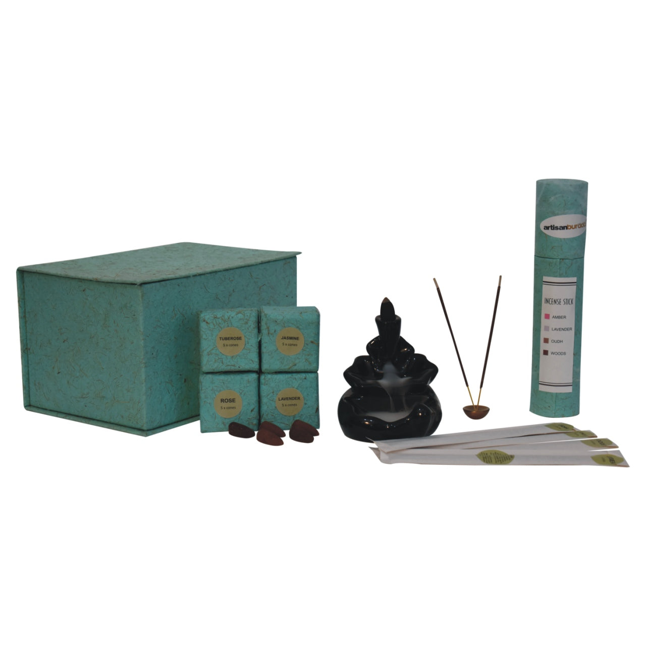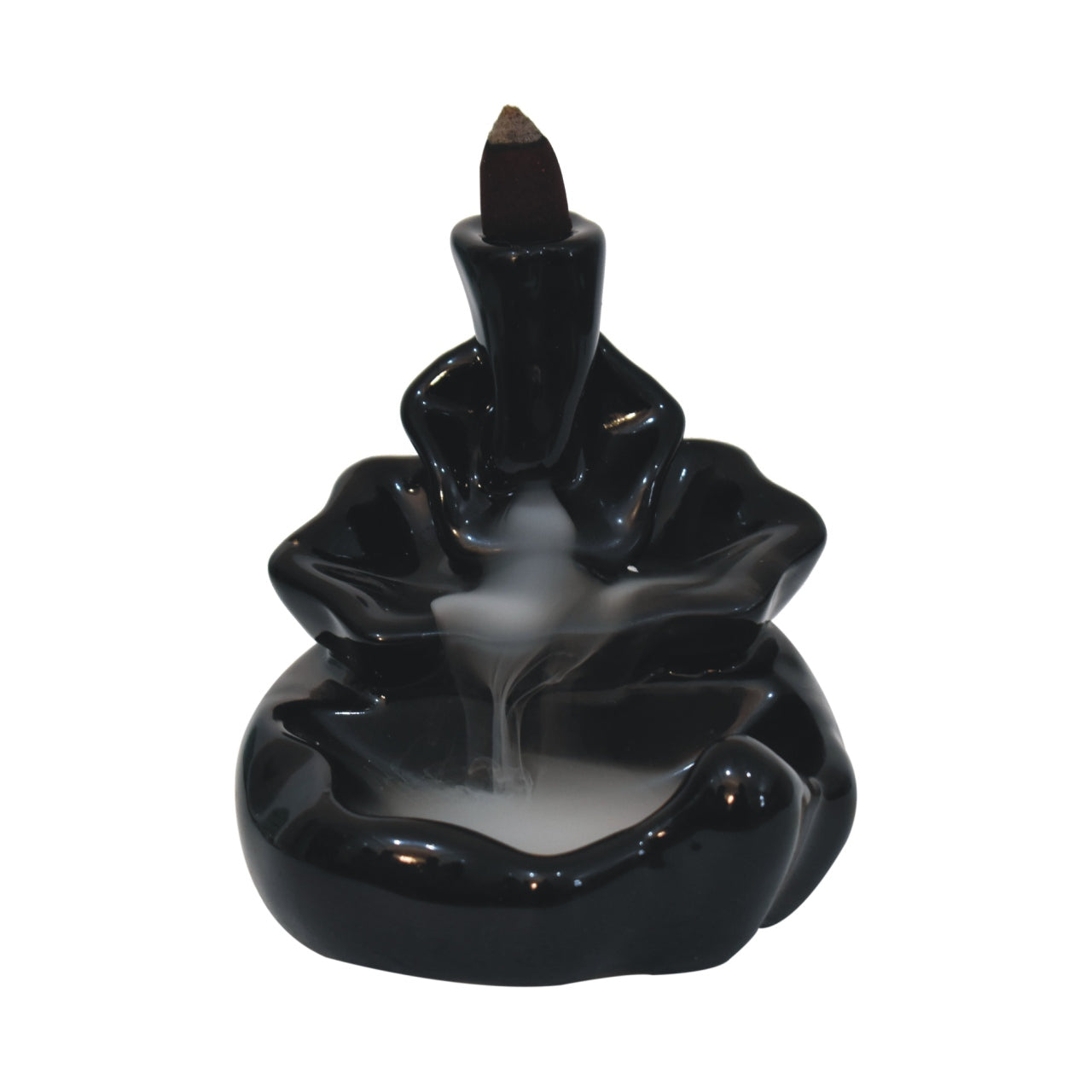 The backflow fountain burner set is exquisitely crafted and features a unique abstract design, ideal as a gift for friends and family. The set includes a backflow burner, incense holder, fragrant backflow cones in Rose, Lavender, Jasmine and Pineapple and fragrant inscense sticks in Amber, Lavender, Oudh and Woods. The incense burner can clean a calm and peaceful environment with the smoke being created in the air to maintain a pleasant body and mind, and improve the efficiency of work and quality of life. Height: 13 cm, Width: 11 cm, Depth: 11 cm Carton Height: 25 cm, Carton Width: 45 cm, Carton Depth: 35 cm