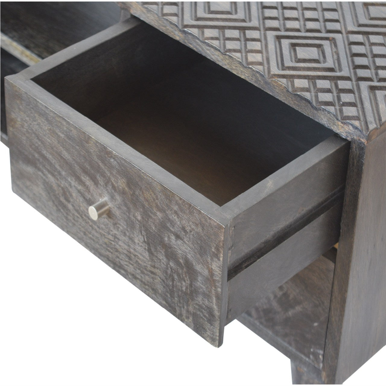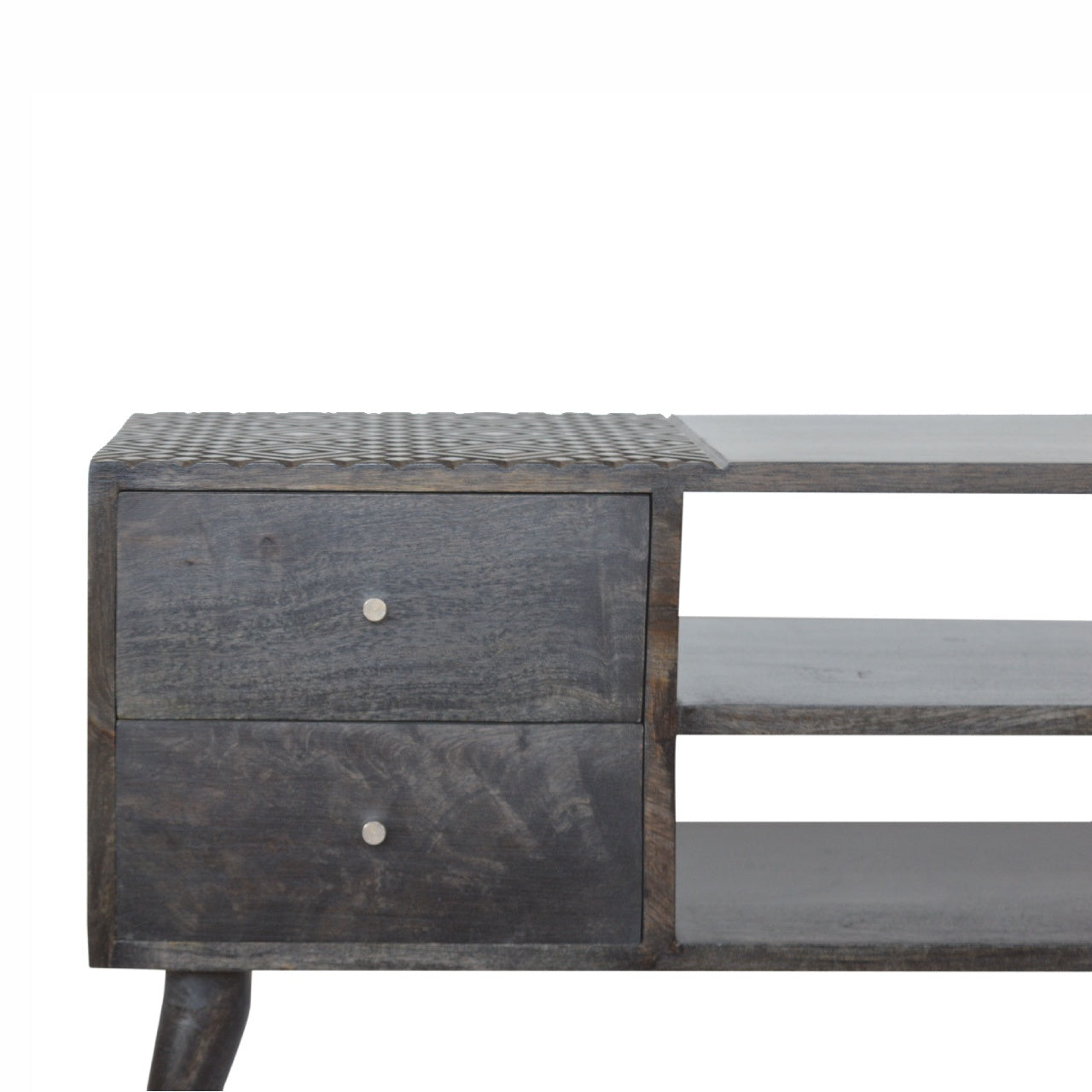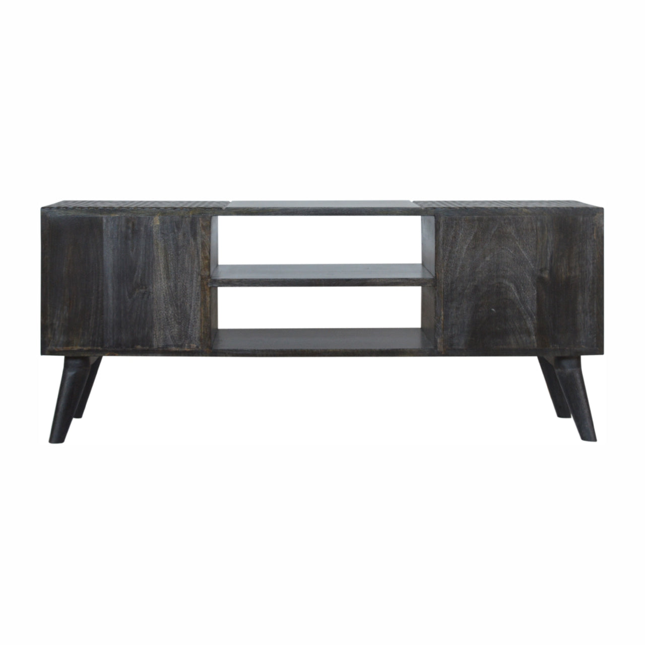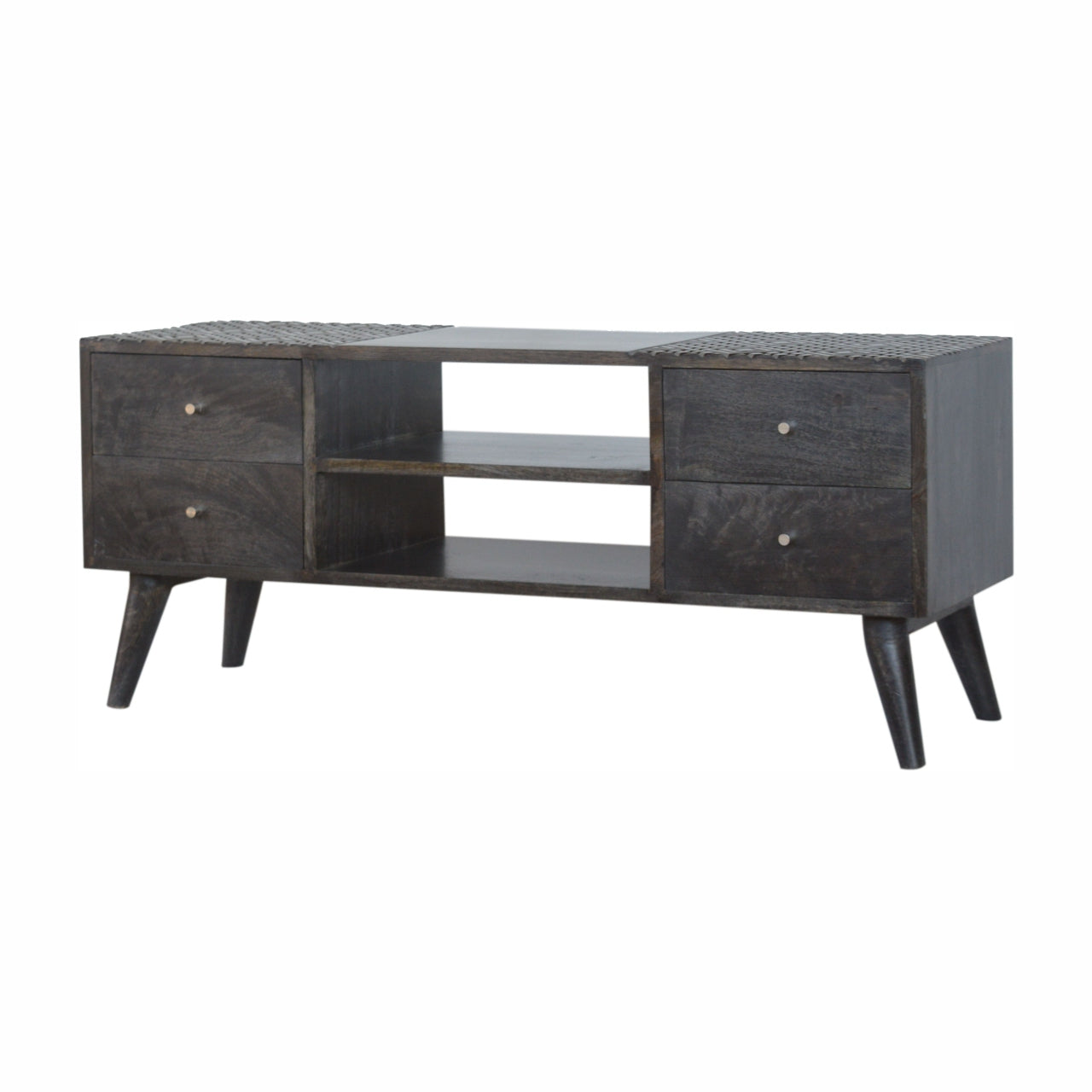 This media unit offers excellent storage with 2 open shelves and 4 drawers. Perfect for use in the living room when it comes to storing bits and pieces you wish to keep out of sight as well as things you wish to display on the open shelves. Constructed from 100% solid mango wood in a ash black finish it features Nordic style legs and shiny brass knobs. Height: 47 cm, Width: 110 cm, Depth: 35 cm Carton Height: 40.0 cm, Carton Width: 120.0 cm, Carton Depth: 45.0 cm