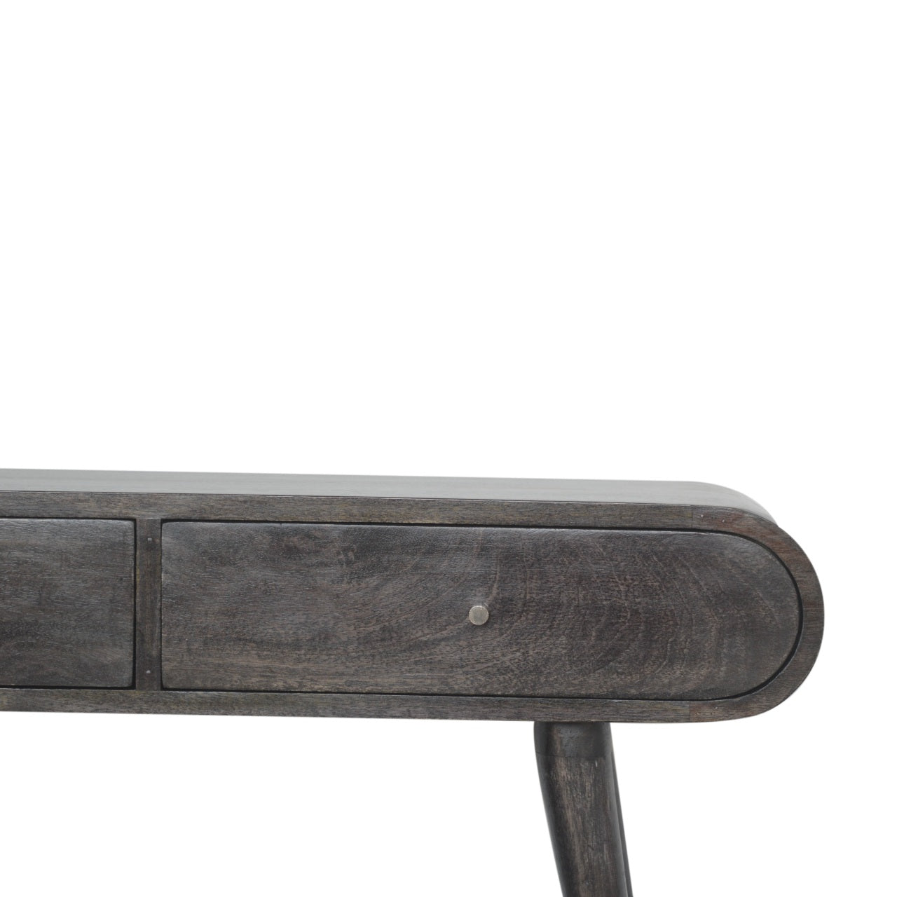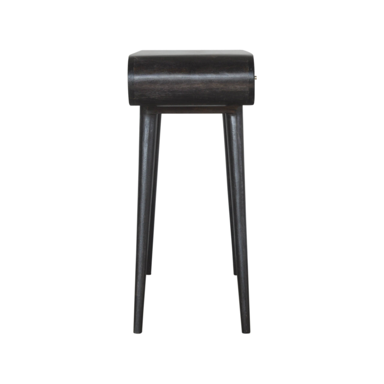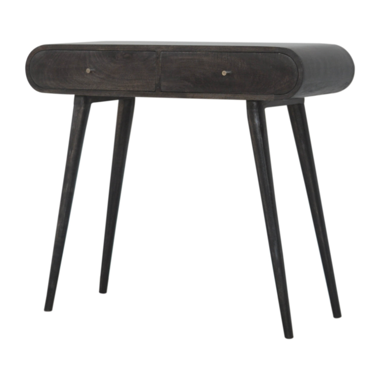 This solid wood console table has been constructed from 100% solid mango wood in a ash black finish and offers a unique shaped design with rounded edges. It features 2 drawers which come with shiny brass knobs and Nordic style legs. A great simple and addition to the home. Height: 78 cm, Width: 90 cm, Depth: 35 cm Carton Height: 35.0 cm, Carton Width: 100.0 cm, Carton Depth: 45.0 cm