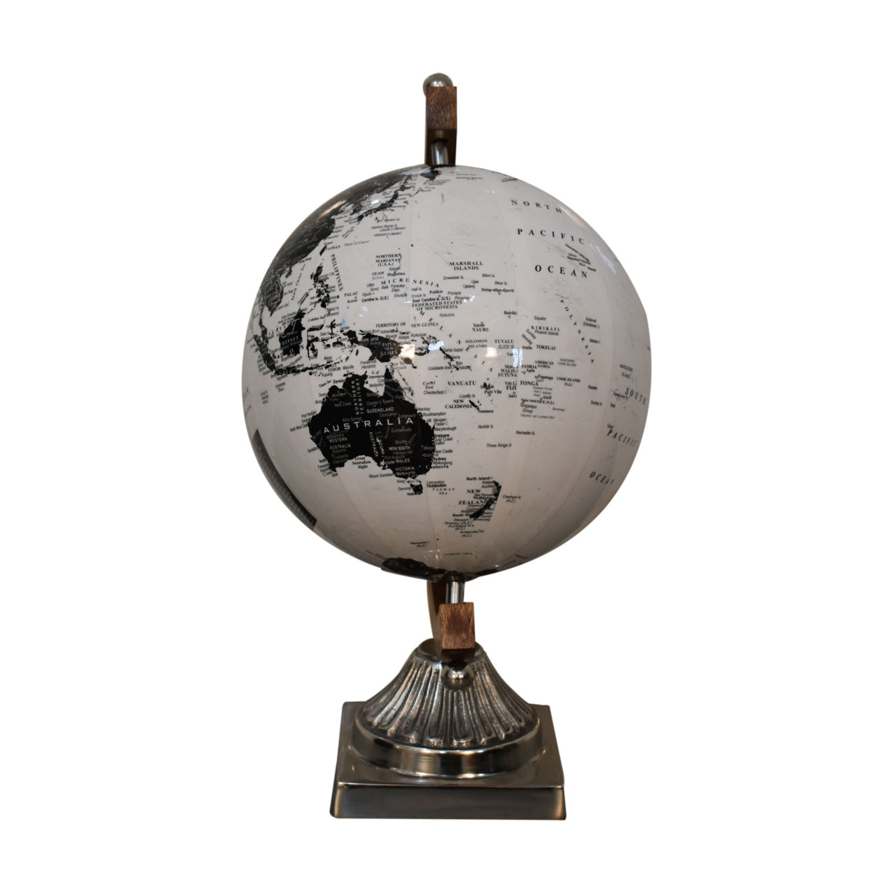 The wooden framed globe boasts a lovely white and black glossy finish. The spherical globe features loose engravings, depicting the world map. The relaxed nature and style of the design creates a striking contrast with the chrome frame. This product is handcrafted individually and as every piece is unique please do expect variations in finish, texture, size and should not be considered as a defect. Height: 35 cm, Width: 26 cm, Depth: 22 cm Carton Height: 50 cm, Carton Width: 41 cm, Carton Depth: 37 cm