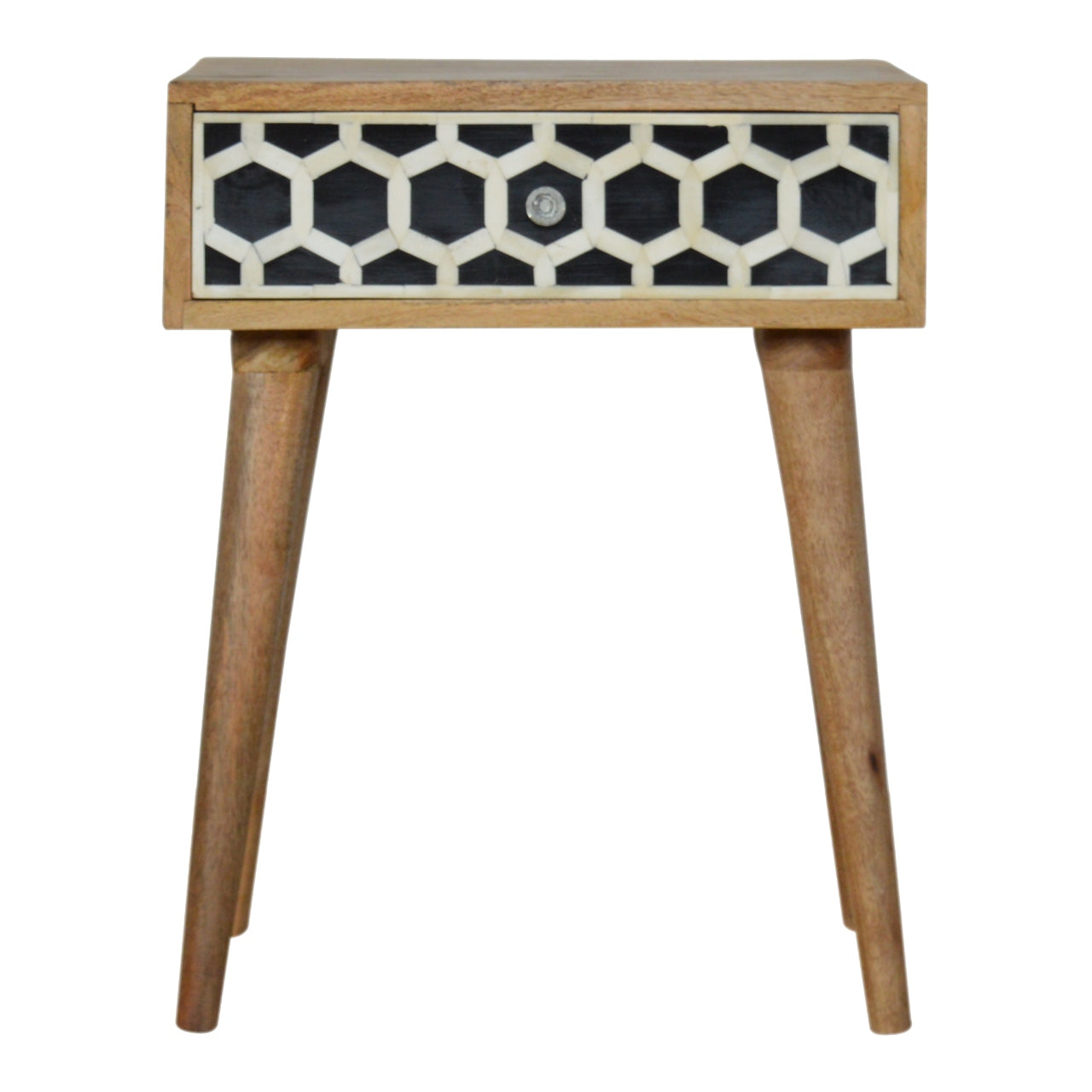 This versatile bedside table will prove handy all over your home. It has been constructed from 100% solid mango wood and has a fine oak-ish finish. It has 1 bone inlay drawer which has features a glass knob and 4 Scandinavian styled legs. Height: 57 cm, Width: 45 cm, Depth: 35 cm Carton Height: 35.0 cm, Carton Width: 55.0 cm, Carton Depth: 45.0 cm