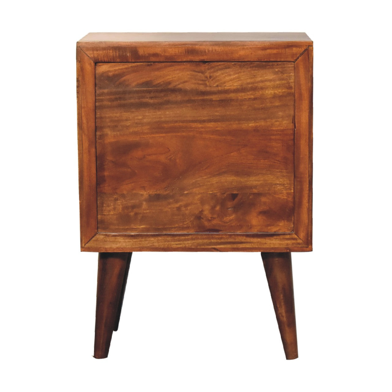 Introducing the "Botanic" Bedside Table, a charming addition to your bedroom. Crafted from 100% Melia/ Neem wood in a chestnut finish, this bedside table showcases natural beauty and warmth. The drawers feature delicate floral carvings, adding a touch of elegance and nature-inspired design. With a convenient knob, accessing your belongings is effortless. The table stands on sleek Nordic-style legs, bringing a modern touch to the classic design. Enjoy the perfect blend of simplicity and sophistication with this functional and stylish choice for your bedroom. Height: 56 cm, Width: 40 cm, Depth: 30 cm Carton Height: 46.0 cm, Carton Width: 50.0 cm, Carton Depth: 40.0 cm