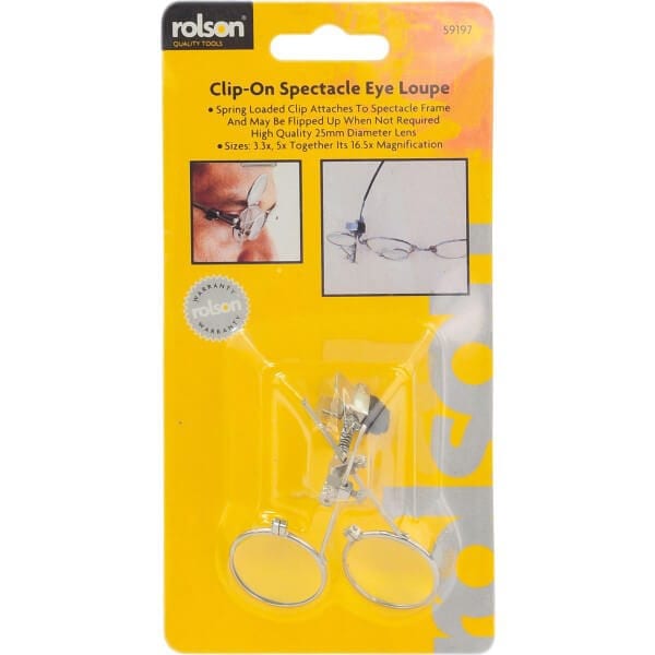 Clip On Spectacle Eye Loupe Spring loaded clip attaches to spectacle frame and may be flipped up when not required. High quality 25mm diameter lens. Sizes 3.3x, 5x, and together create 16.5x magnification
