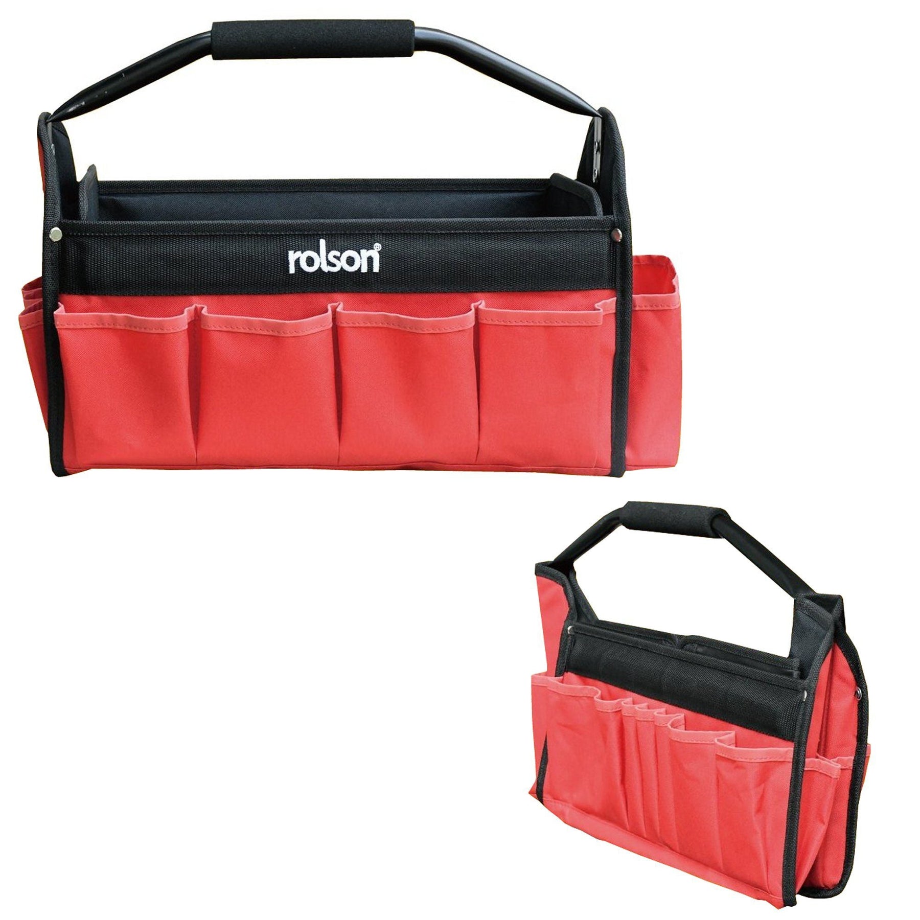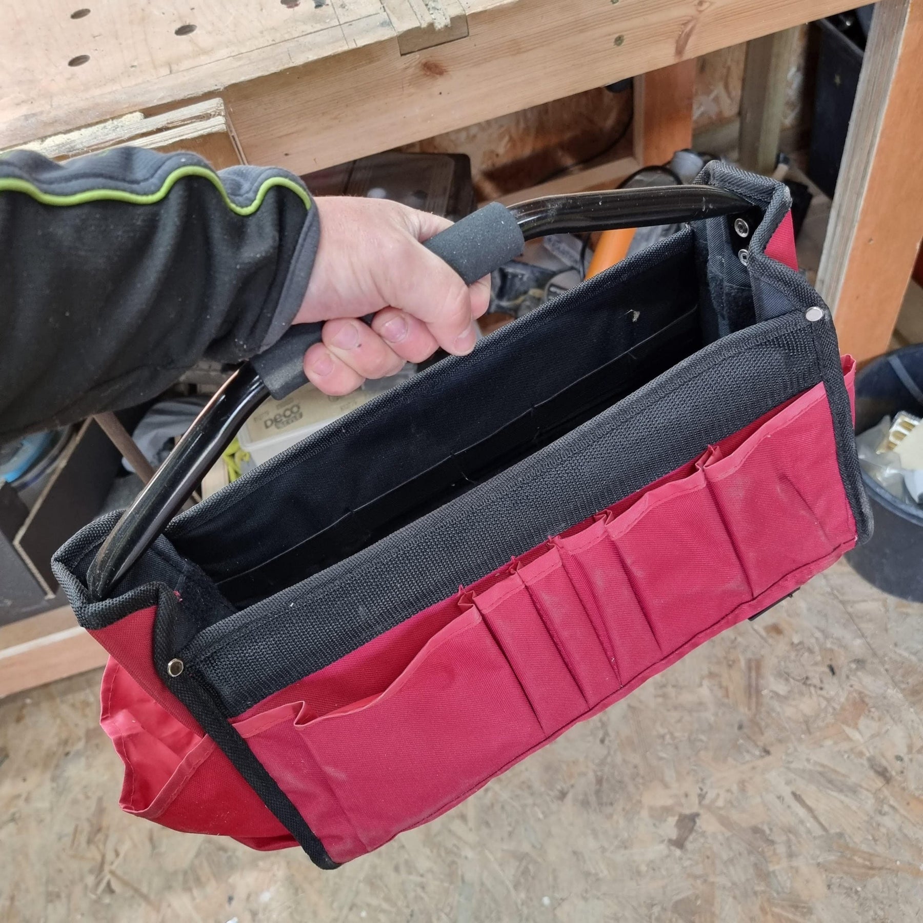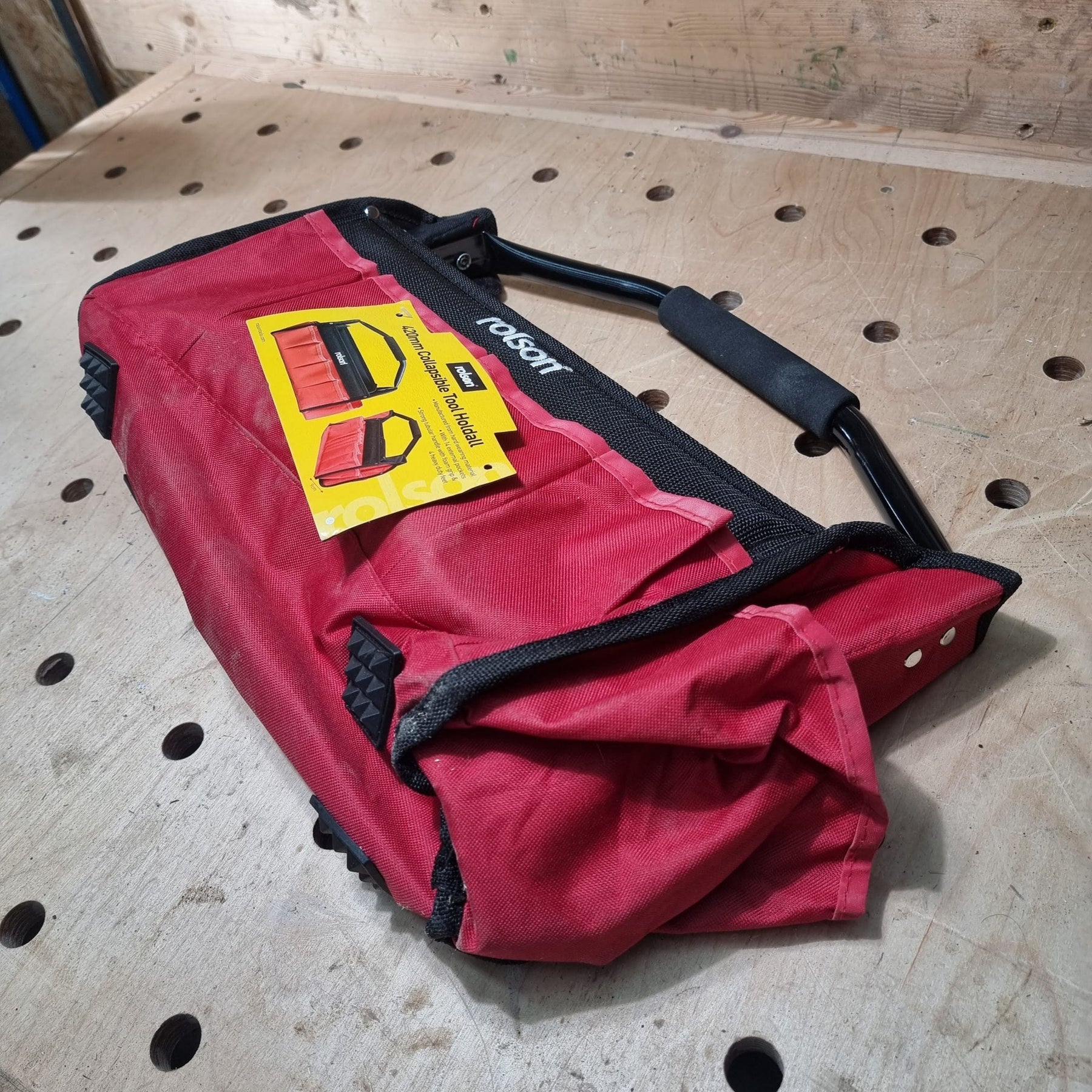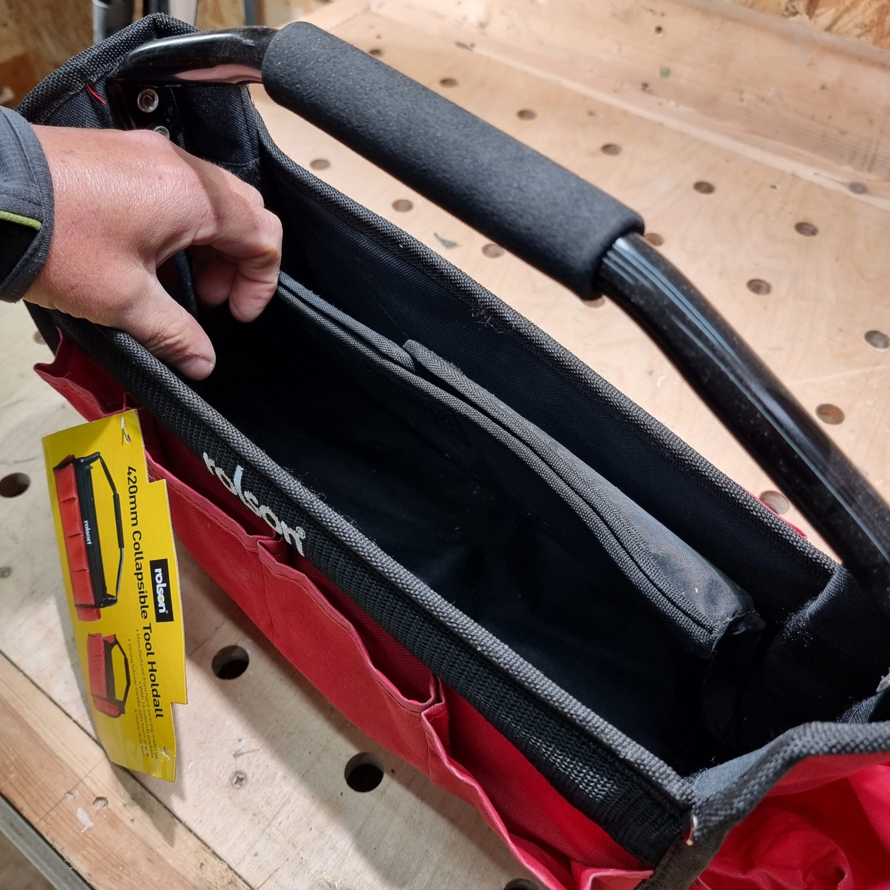 A tool holdall which can also pack down to almost nothing when not in use. A great addition to a workshop tool set. Manufactured from hard wearing material with fourteen external pockets. It has a strong tubular handle with foam grip and four heavy duty feet. The internal dividers can be positioned to suit your needs with elasticated tool loops. The overall dimension expanded is 42 x 18 x 28cm while it folds flat to a footprint of 45cm x 35cm x 5cm STRONG - rip resistant, rot proof durable material MULTIPLE POCKETS - 4at6cm, deep end pockets , 3 narrower end pockets 6 tool side pockets - 1at1ccm,3 at 2cm,1x6cm,1at8cm INTERNAL DIVIDERS - folded divider and be made into1,2 or 3 sections with velcro fastenings INTERNAL LOOPS - 5 elasticated internal tool loops METAL HANDLE - strong rust proof metal handle with soft grip and rivetted fastenings FEET - 4 stronger rubberised feet INTERNAL BRACING - end bracing for extra strength SIZE Expanded is 42 x 18 x 28cm folds flat to 45cm x 35cm x 5cm Weight 1Kg