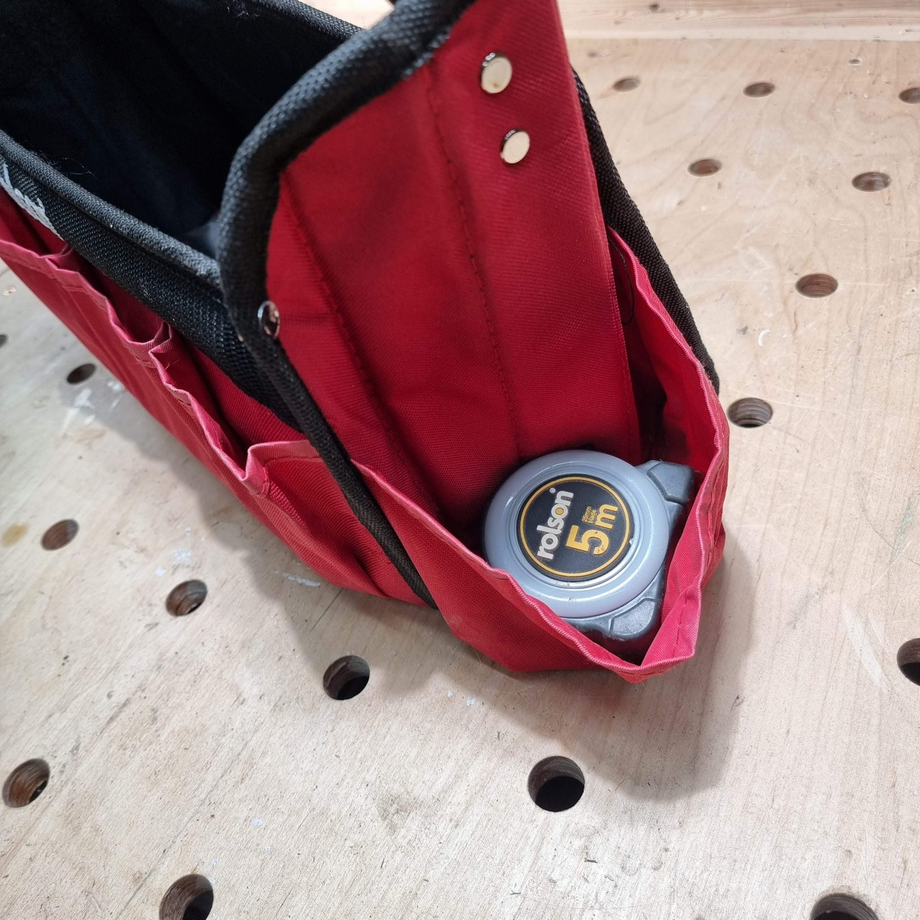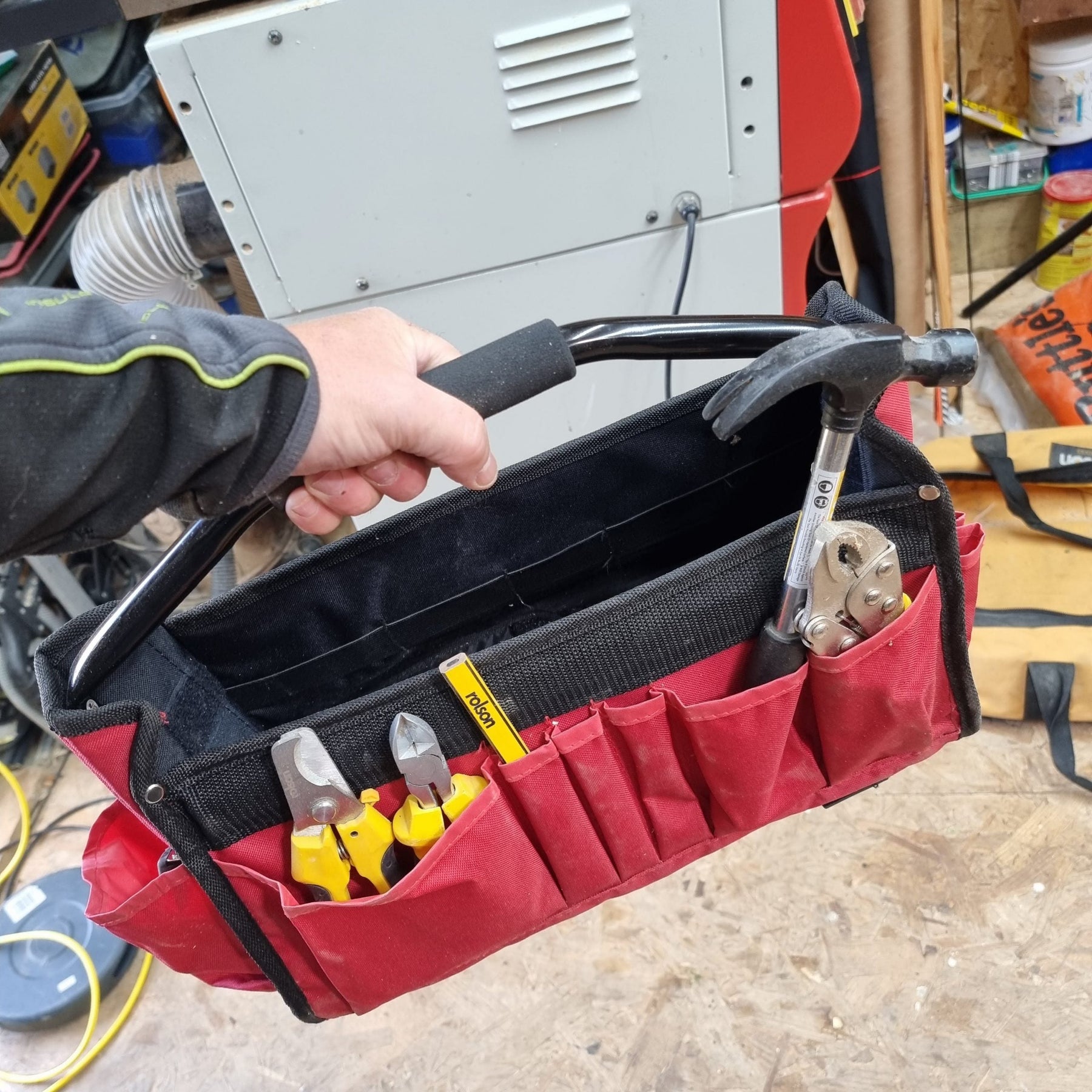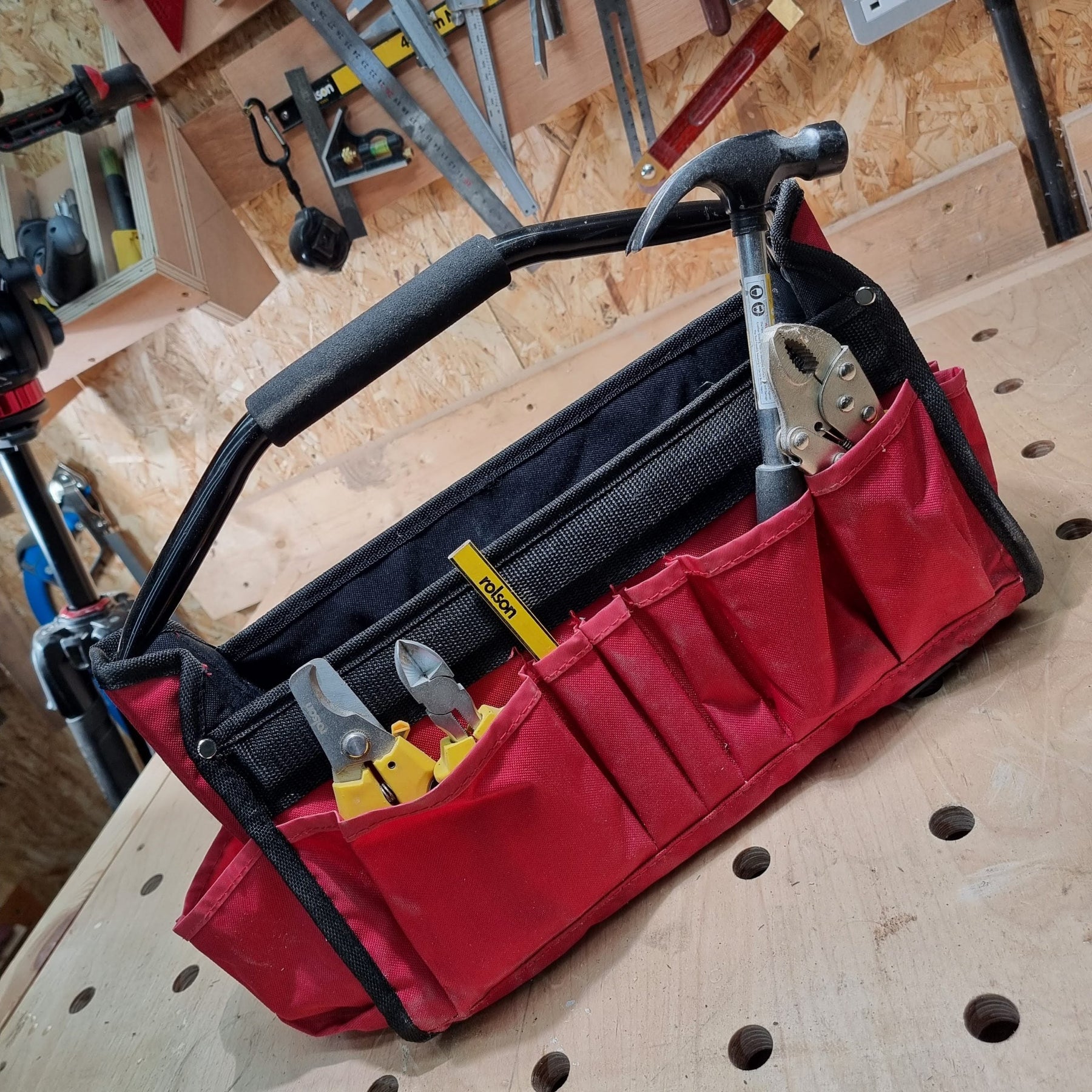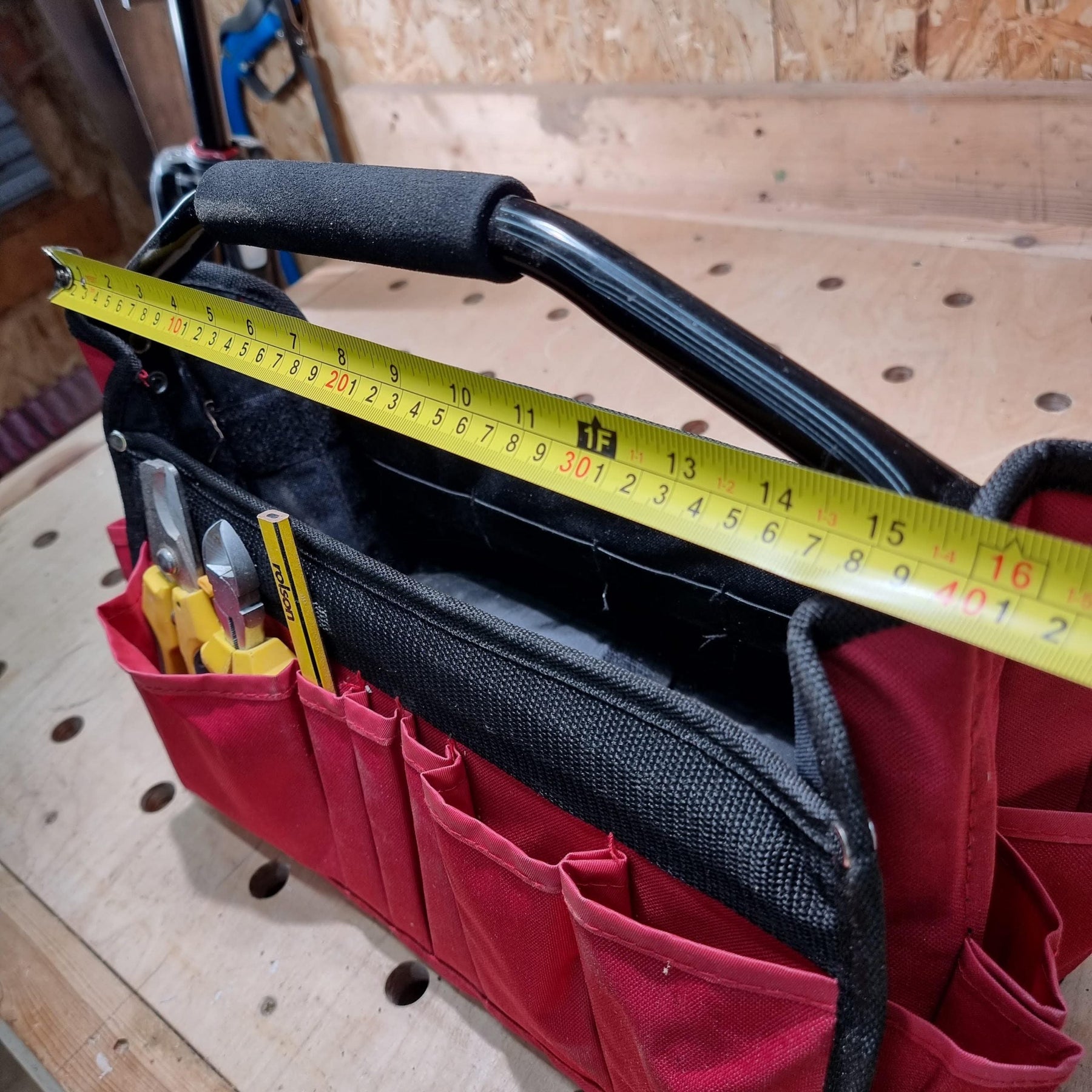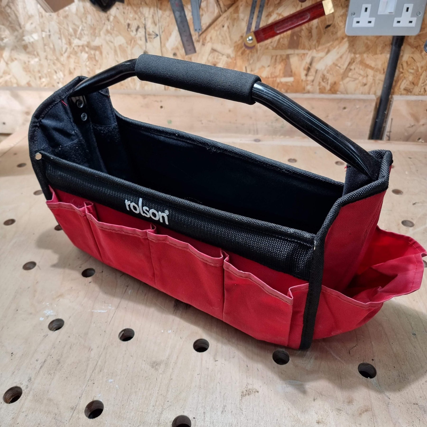 A tool holdall which can also pack down to almost nothing when not in use. A great addition to a workshop tool set. Manufactured from hard wearing material with fourteen external pockets. It has a strong tubular handle with foam grip and four heavy duty feet. The internal dividers can be positioned to suit your needs with elasticated tool loops. The overall dimension expanded is 42 x 18 x 28cm while it folds flat to a footprint of 45cm x 35cm x 5cm STRONG - rip resistant, rot proof durable material MULTIPLE POCKETS - 4at6cm, deep end pockets , 3 narrower end pockets 6 tool side pockets - 1at1ccm,3 at 2cm,1x6cm,1at8cm INTERNAL DIVIDERS - folded divider and be made into1,2 or 3 sections with velcro fastenings INTERNAL LOOPS - 5 elasticated internal tool loops METAL HANDLE - strong rust proof metal handle with soft grip and rivetted fastenings FEET - 4 stronger rubberised feet INTERNAL BRACING - end bracing for extra strength SIZE Expanded is 42 x 18 x 28cm folds flat to 45cm x 35cm x 5cm Weight 1Kg