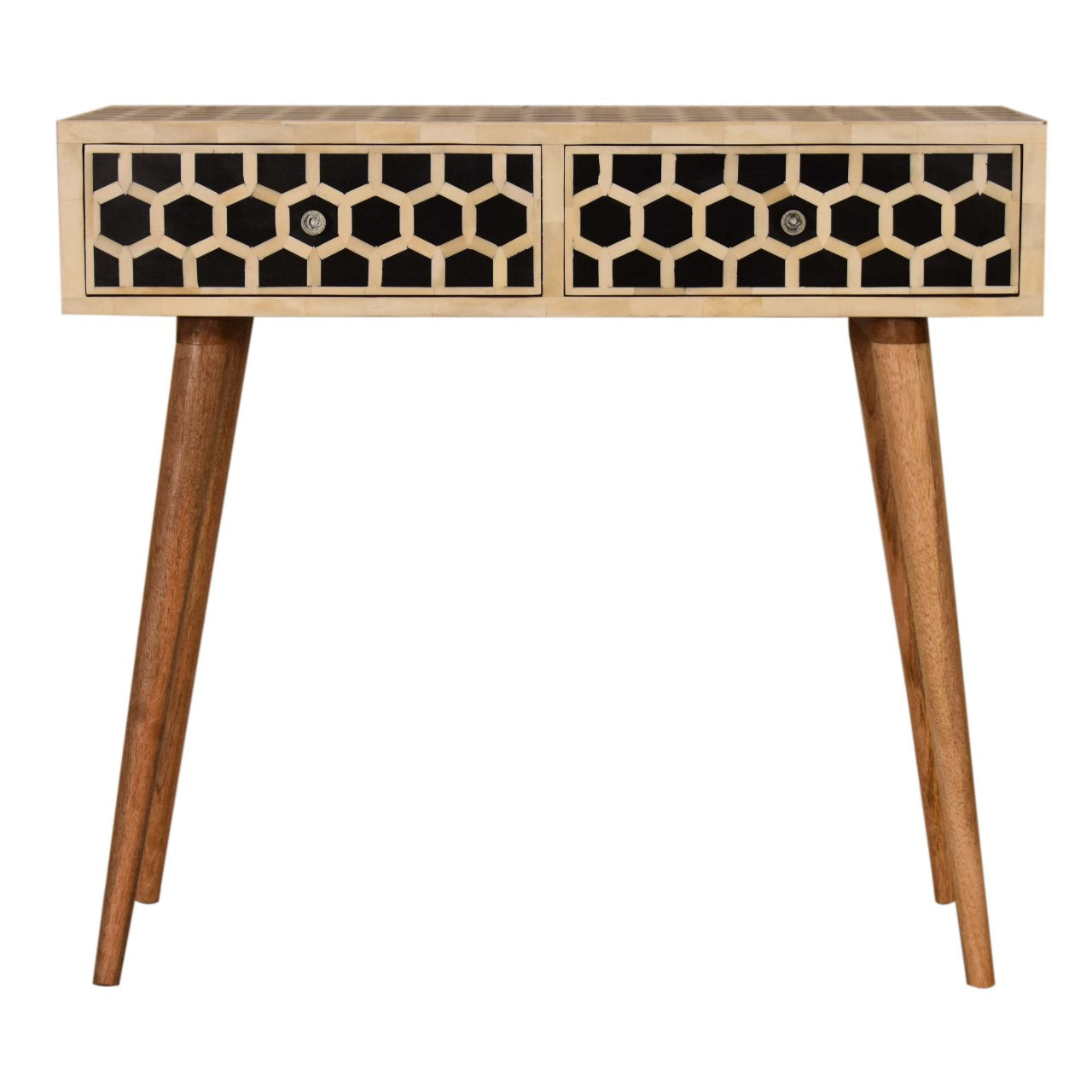 This console table has a clean and simple design to suit most homes. It has a lovely oak-ish finish and features 2 bone inlay drawer draws which have a honeycomb pattern and 2 glass knobs. Some other features 4 Scandinavian style legs. Height: 82 cm, Width: 90 cm, Depth: 35 cm Carton Height: 37.0 cm, Carton Width: 100.0 cm, Carton Depth: 45.0 cm