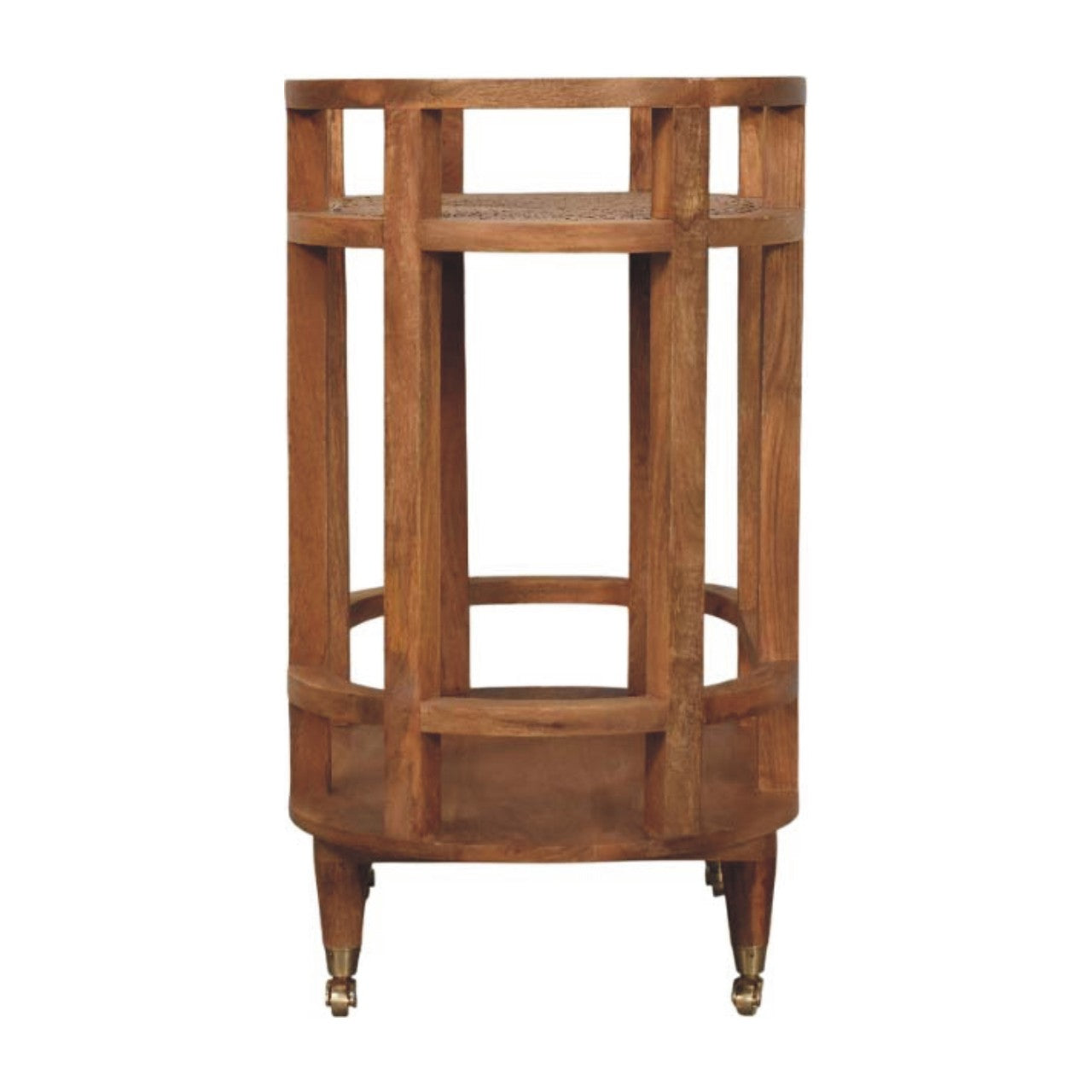 Elevate your hosting game with the Isla Curved Butler Console, beautifully handcrafted from 100% solid mango wood in a rich Golden Teak finish. This distinctive piece features a graceful curved frame, twin tiers for practical storage, and smooth-rolling castor legs for mobility. A handwoven rattan shelf adds a touch of natural elegance, making this console a stylish accent for entertaining or everyday sophistication. Height: 89 cm, Width: 90 cm, Depth: 50 cm Carton Height: 80 cm, Carton Width: 100 cm, Carton Depth: 60 cm