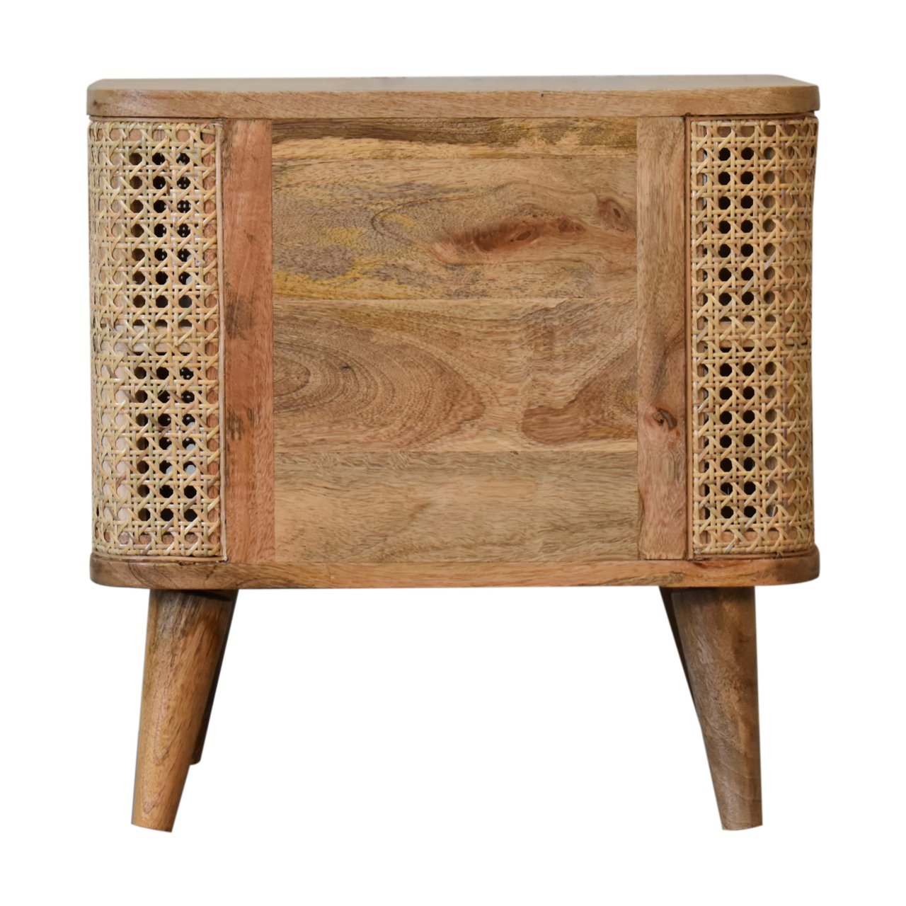 The Larissa bedside will stand out in your interior thanks to its understated look and subtle originality. The beautiful grain pattern and rattan design do not make this sideboard any less functional. In fact, it features 2 mini drawers and ample space on top for a lamp, plant or candle. It has been constructed from 100% solid mango wood in an oak-ish finish and features nordic style legs. Height: 46 cm, Width: 45 cm, Depth: 35 cm Carton Height: 40.0 cm, Carton Width: 55.0 cm, Carton Depth: 45.0 cm