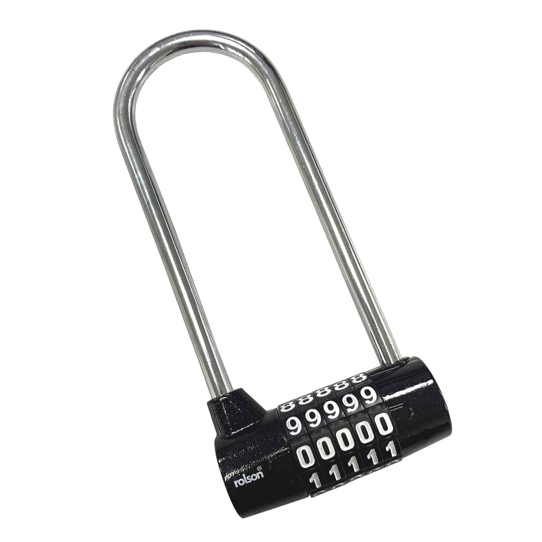Long Shackle Combination Lock - Manufactured with zinc body and steel shackle. 5 digit resettable combination dial. Overall dimensions 64 x 125 x 70mm