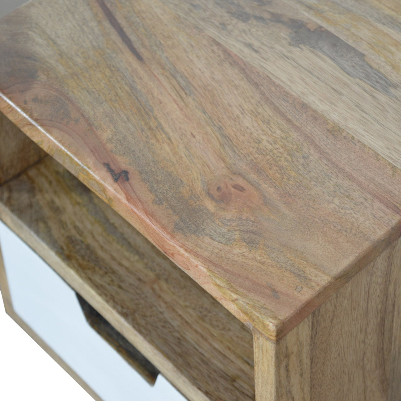 This beautifully designed bedside is constructed from 100% solid mango wood and has a fine oak-ish finish. Useful storage space is available with a 1 white hand painted drawer, 1 shelf and a decent sized table top to place any ornaments. Other features include 4 Scandinavian styled legs to give the piece a modern style which will suit most interiors. Height: 57 cm, Width: 30 cm, Depth: 30 cm Carton Height: 45.0 cm, Carton Width: 40.0 cm, Carton Depth: 40.0 cm