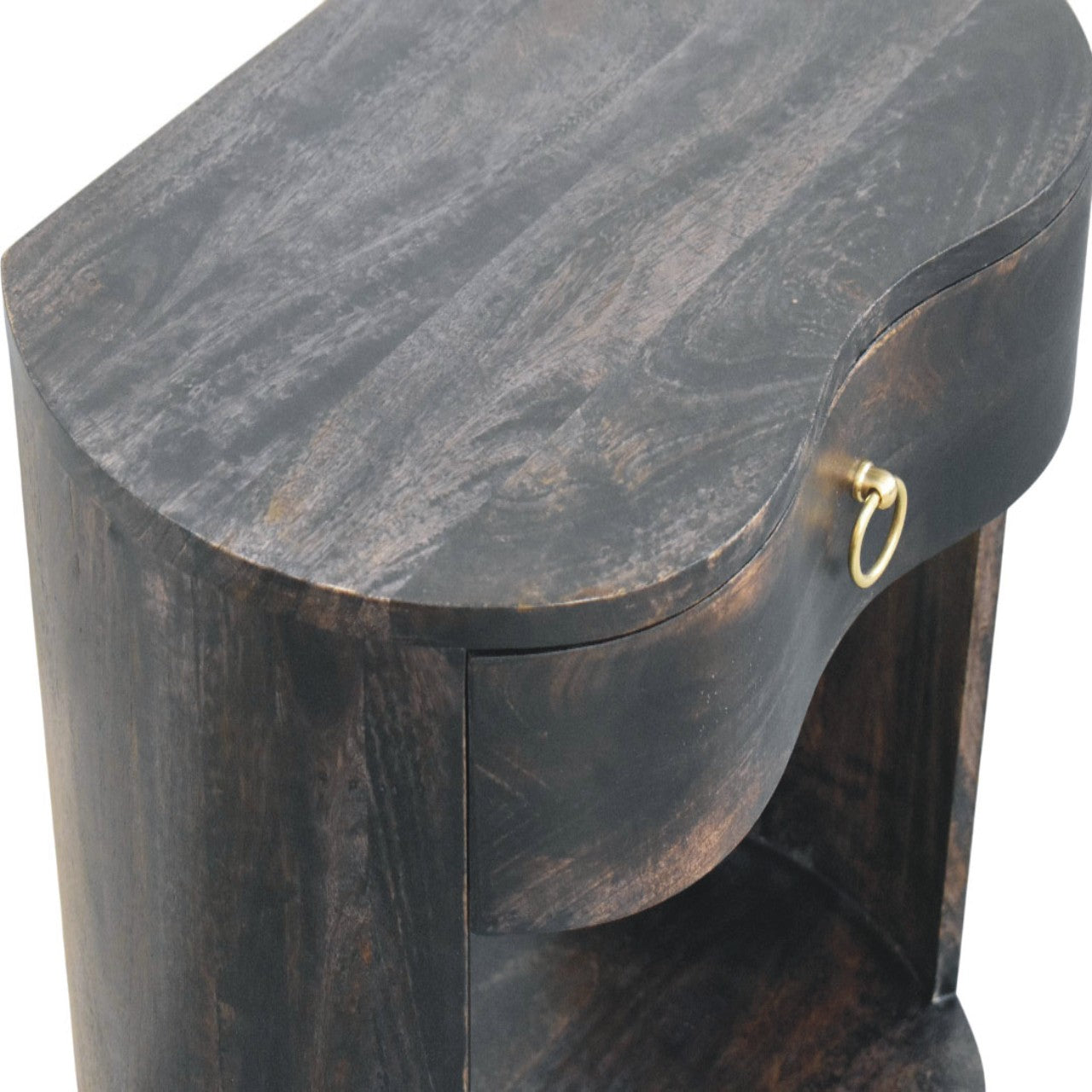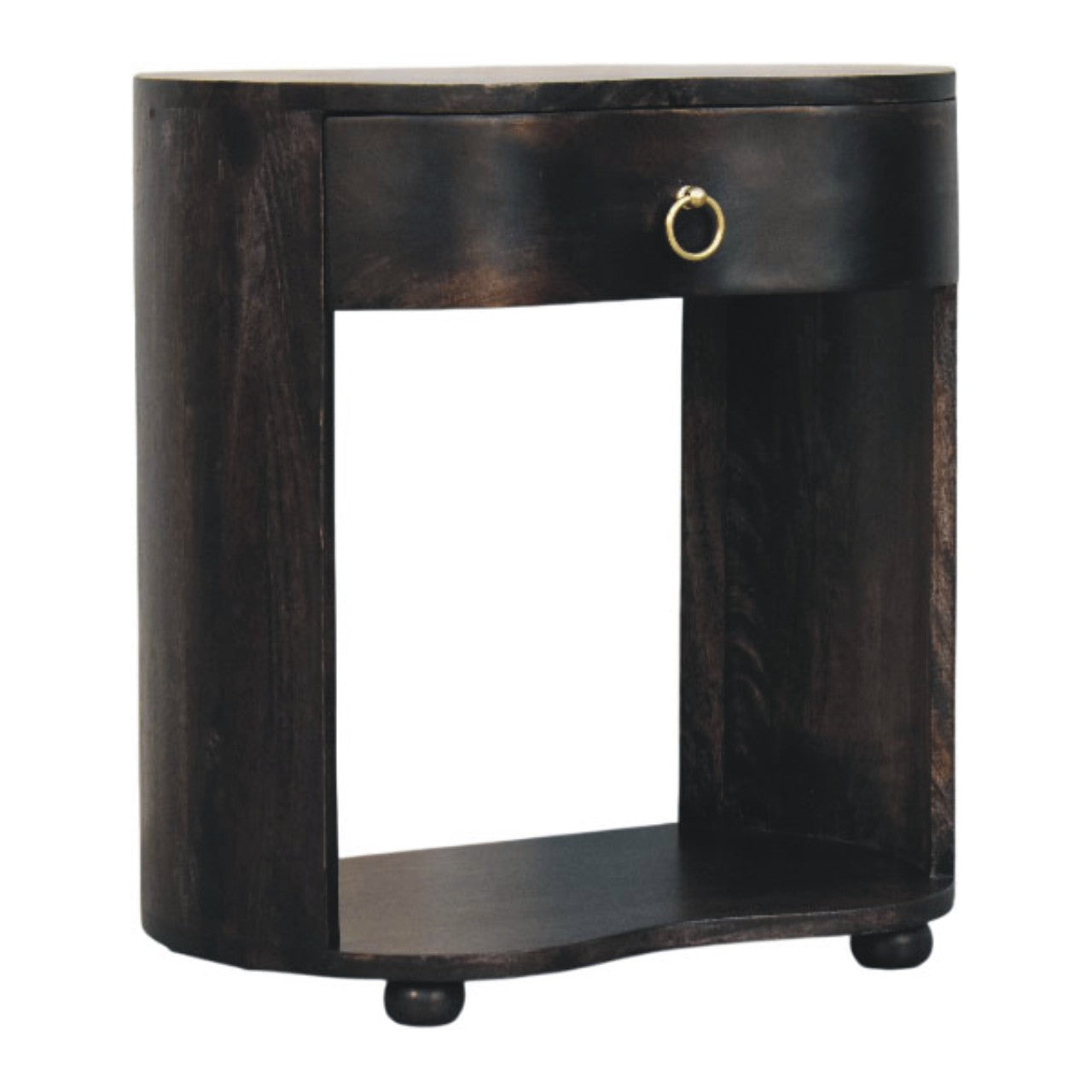 The Monroe Bedside captures the essence of classic elegance with a contemporary edge. Handcrafted from 100% solid mango wood in a deep Carbon Ash finish, it features a sleek semicircular form highlighted by a single drawer with a distinctive brass ring pull. The open lower shelf offers versatile storage or display space, while the smooth curves and rich tones lend a touch of sophistication to any bedroom. Perfectly balancing style and function, the Monroe Bedside is a refined piece that enhances both traditional and modern interiors. Height: 58 cm, Width: 55 cm, Depth: 35 cm Carton Height: 68 cm, Carton Width: 65 cm, Carton Depth: 45 cm