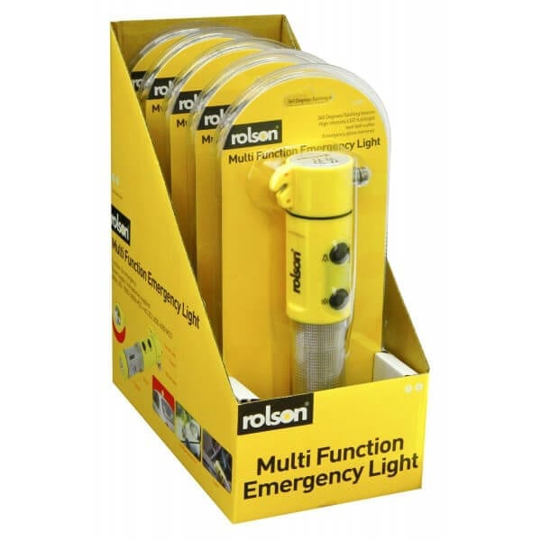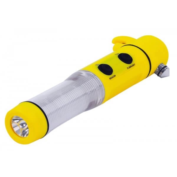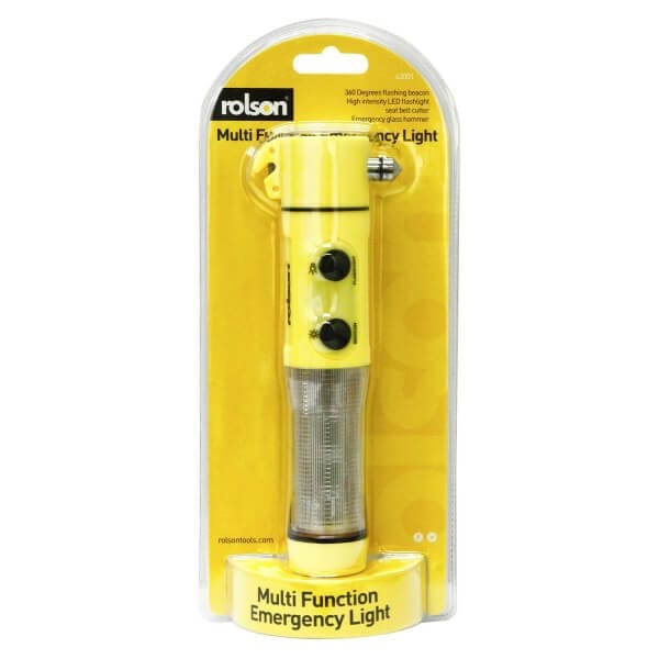 Multi Function Emergency Light Functions include torch, 360 degrees red LED flashing beacon, seatbelt cutter and hammer, complete with magnetic base. Ideal for most emergencies. Supplied with 2AA batteries