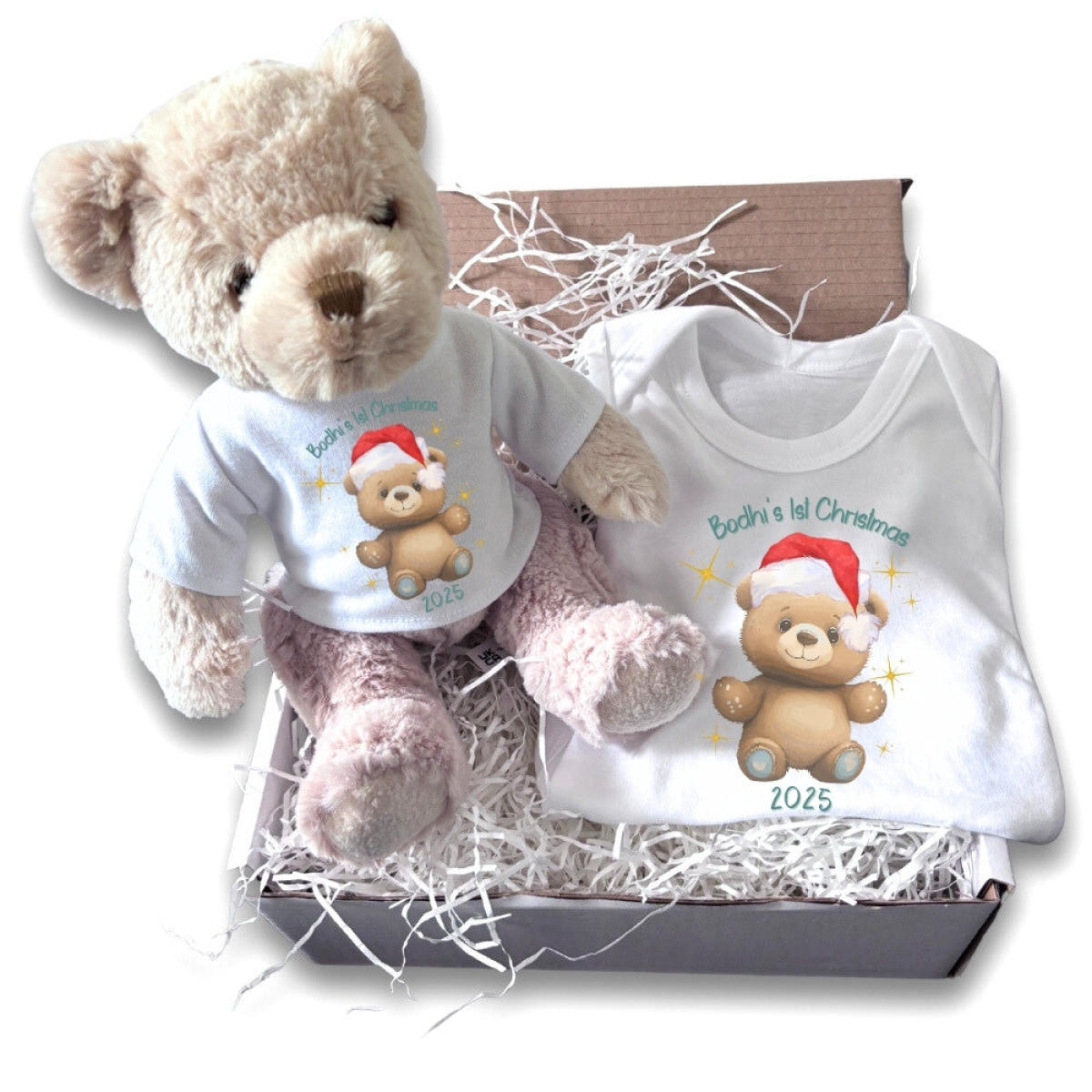 This Happy 1st Christmas Teddy Gift Hamper features an adorable teddy bear dressed in a white t-shirt paired with a matching baby vest. This design has a cute teddy with a Santa hat and can personalised with a baby name and year. It makes an excellent and thoughtful gift for a baby's 1st Christmas.