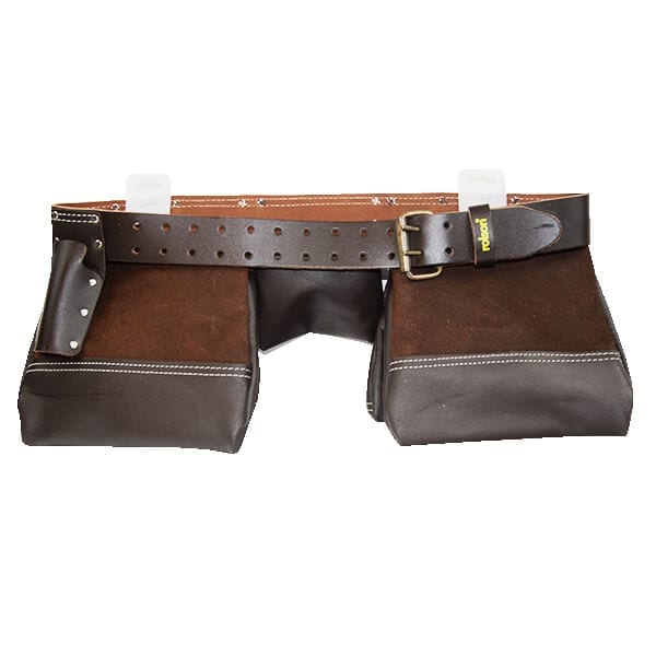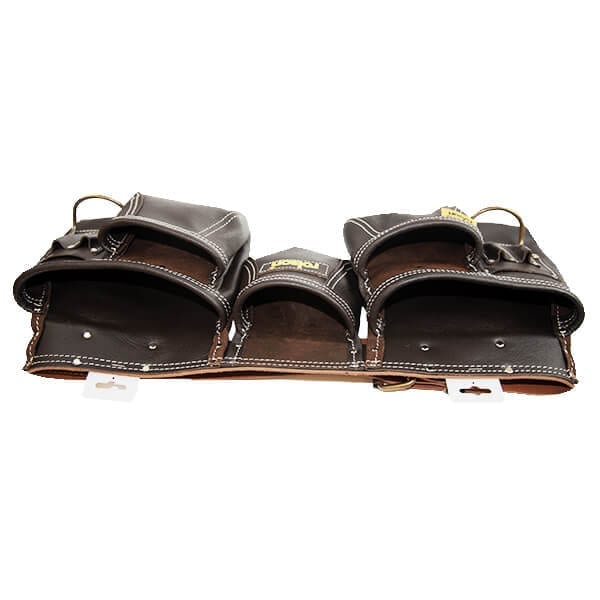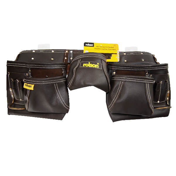 Oil Tanned 13 Pocket Double Leather Tool Belt Manufactured from oil tanned leather, 2 large main pockets, 2 medium size flared pockets & 6 small tool pockets, 2 metal hammer holder, leather tape pocket, scaffolding spanner holder, rivet reinforced for added strength, 50mm leather belt with two pin steel buckle.